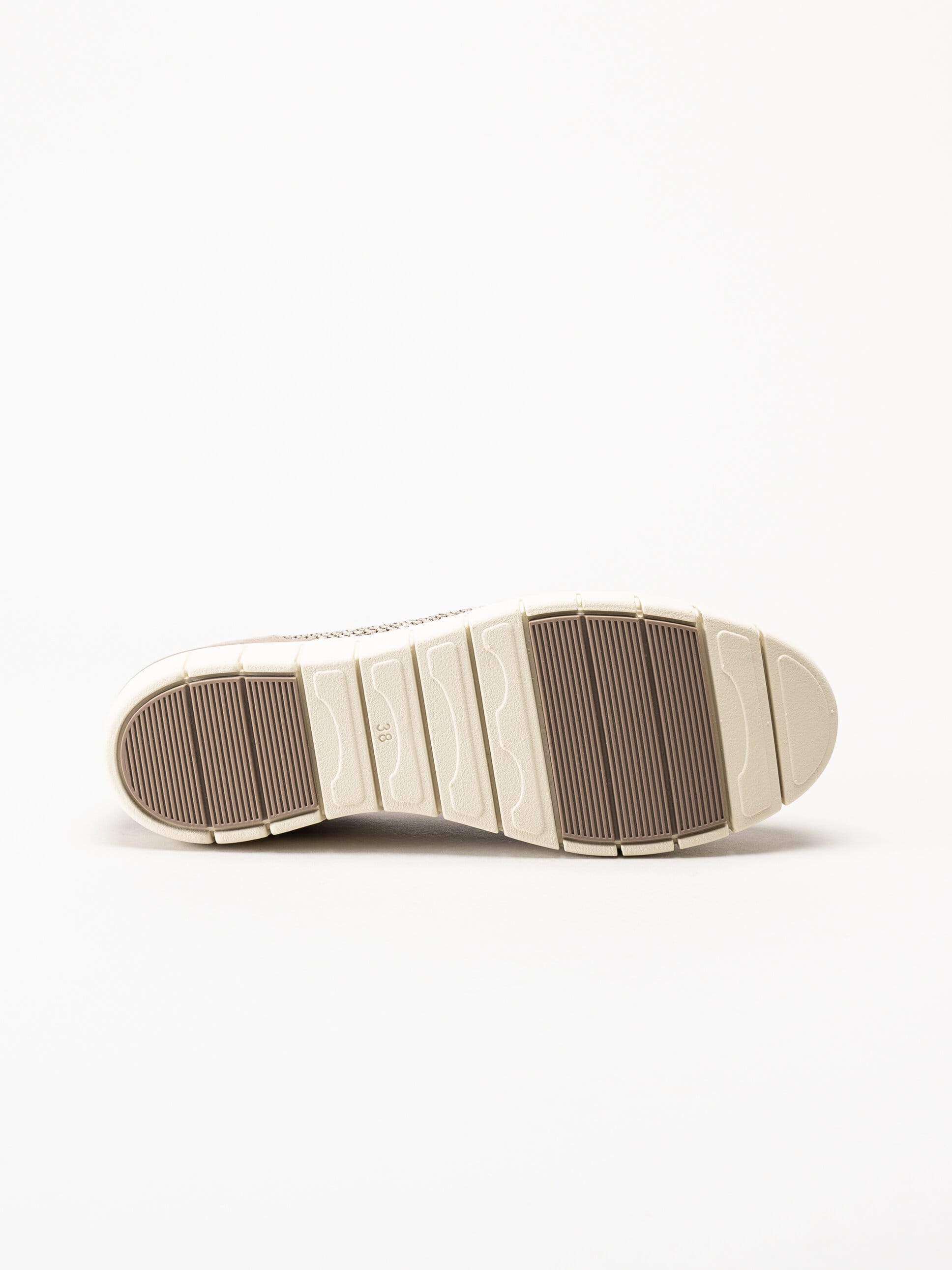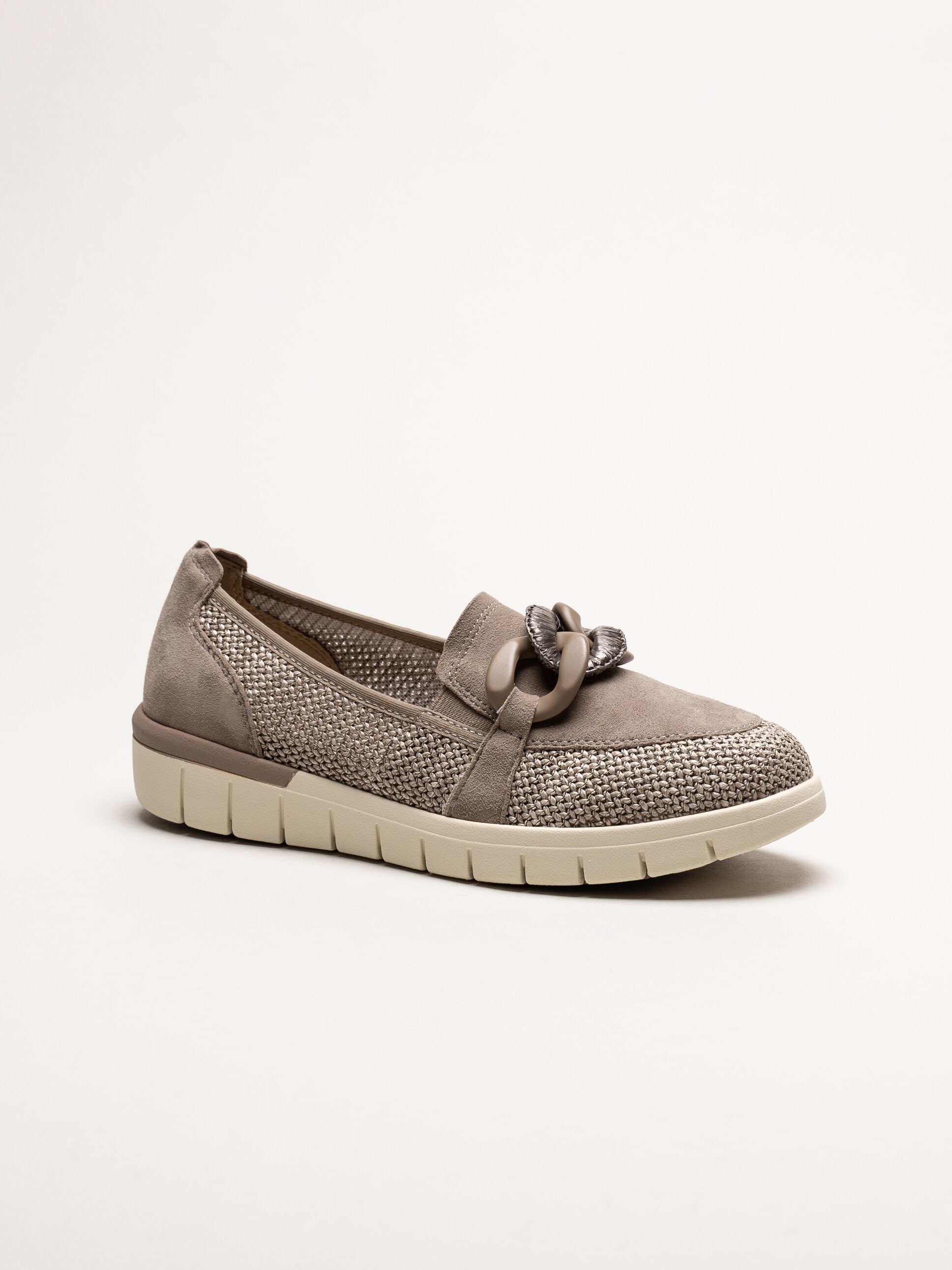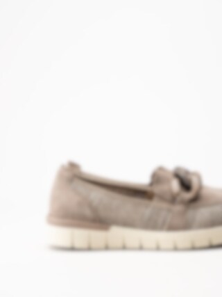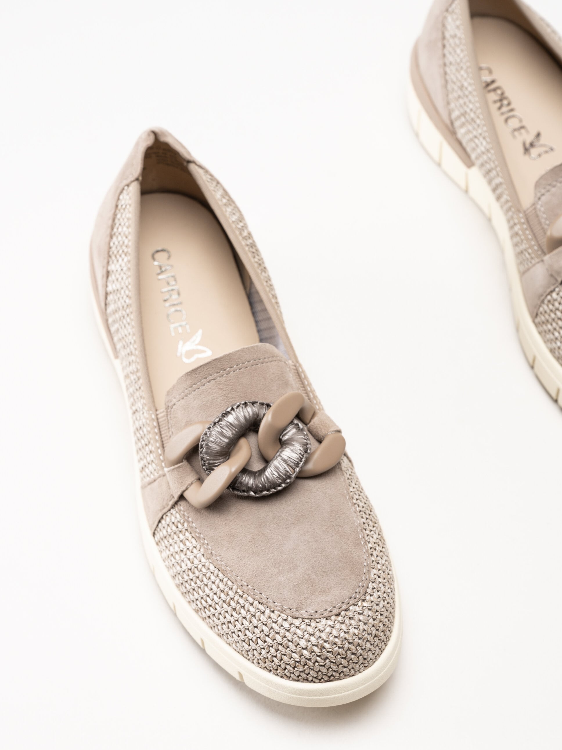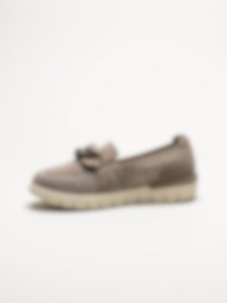 Bruna pennyloafers i mocka från Caprice i färgen Mud Comb. Skorna är tillverkade i mjuk mocka i kombination med textil, vilket ger ett klassiskt och elegant uttryck med hög komfort. Den tidlösa pennyloafer-designen gör dem enkla att matcha till både vardagliga och mer uppklädda outfits. Modellen har en rymlig passform med H-läst och är utrustad med Caprices Airmotion-teknologi, som ger förbättrad luftcirkulation och effektiv stötdämpning för ökad komfort under hela dagen.