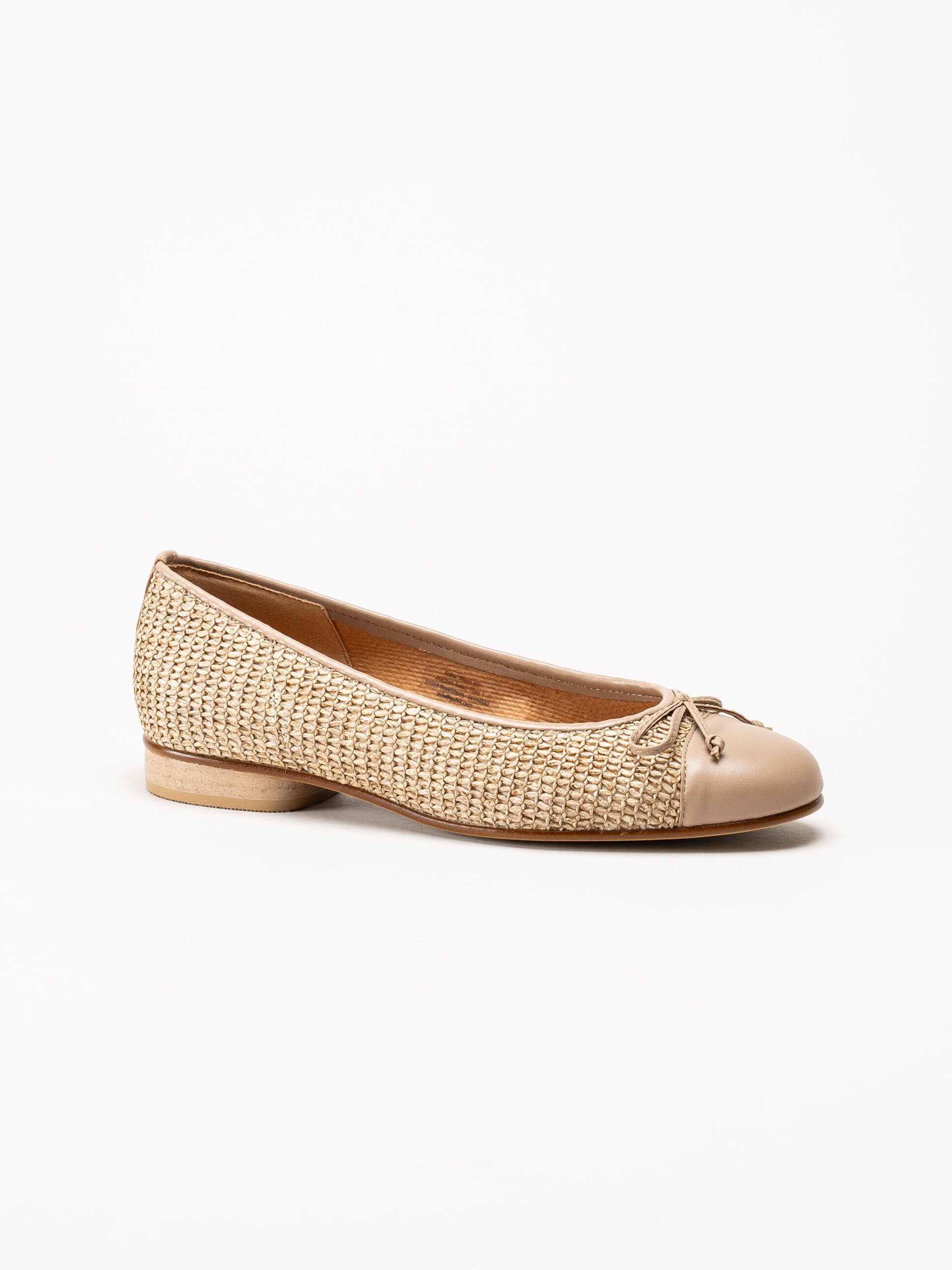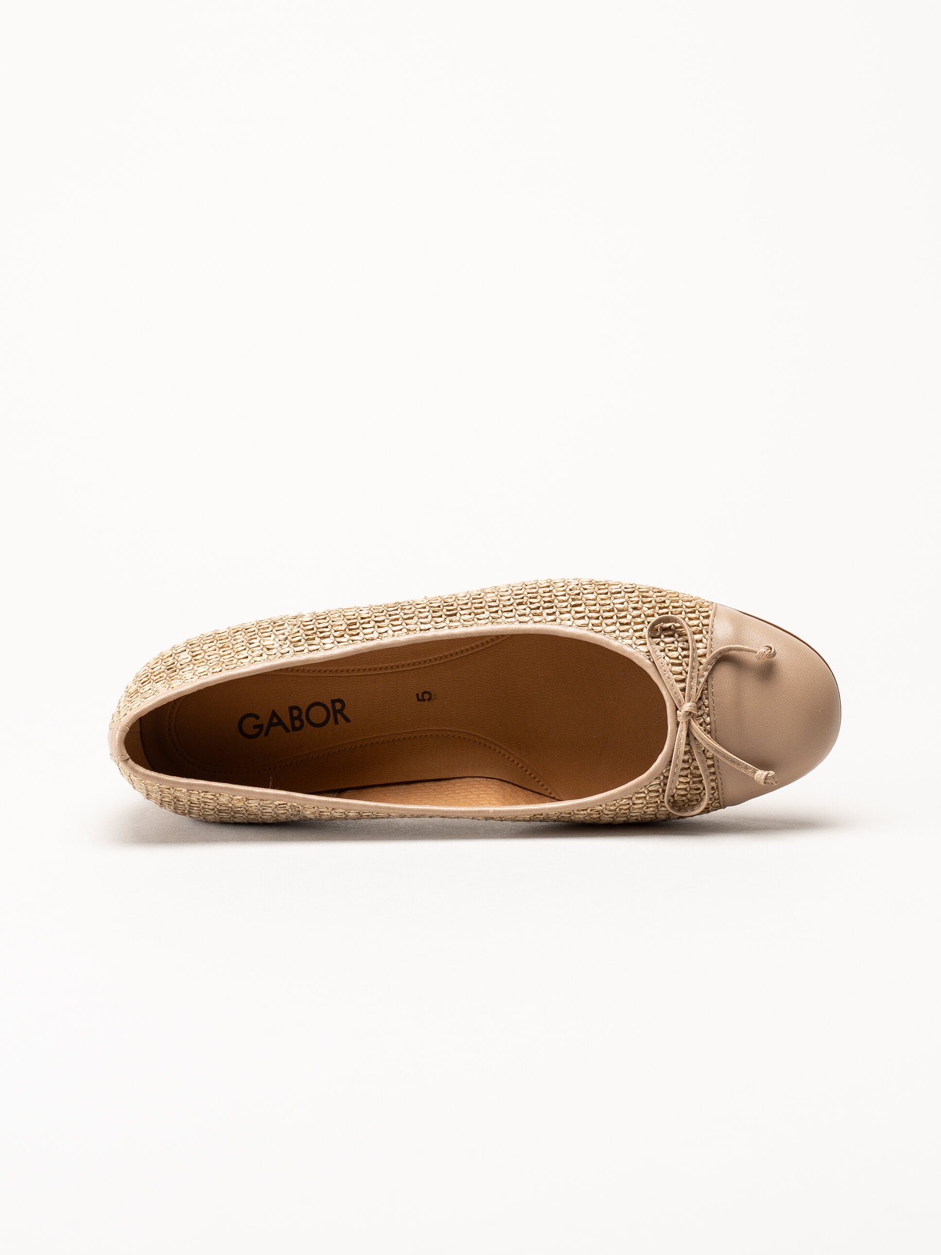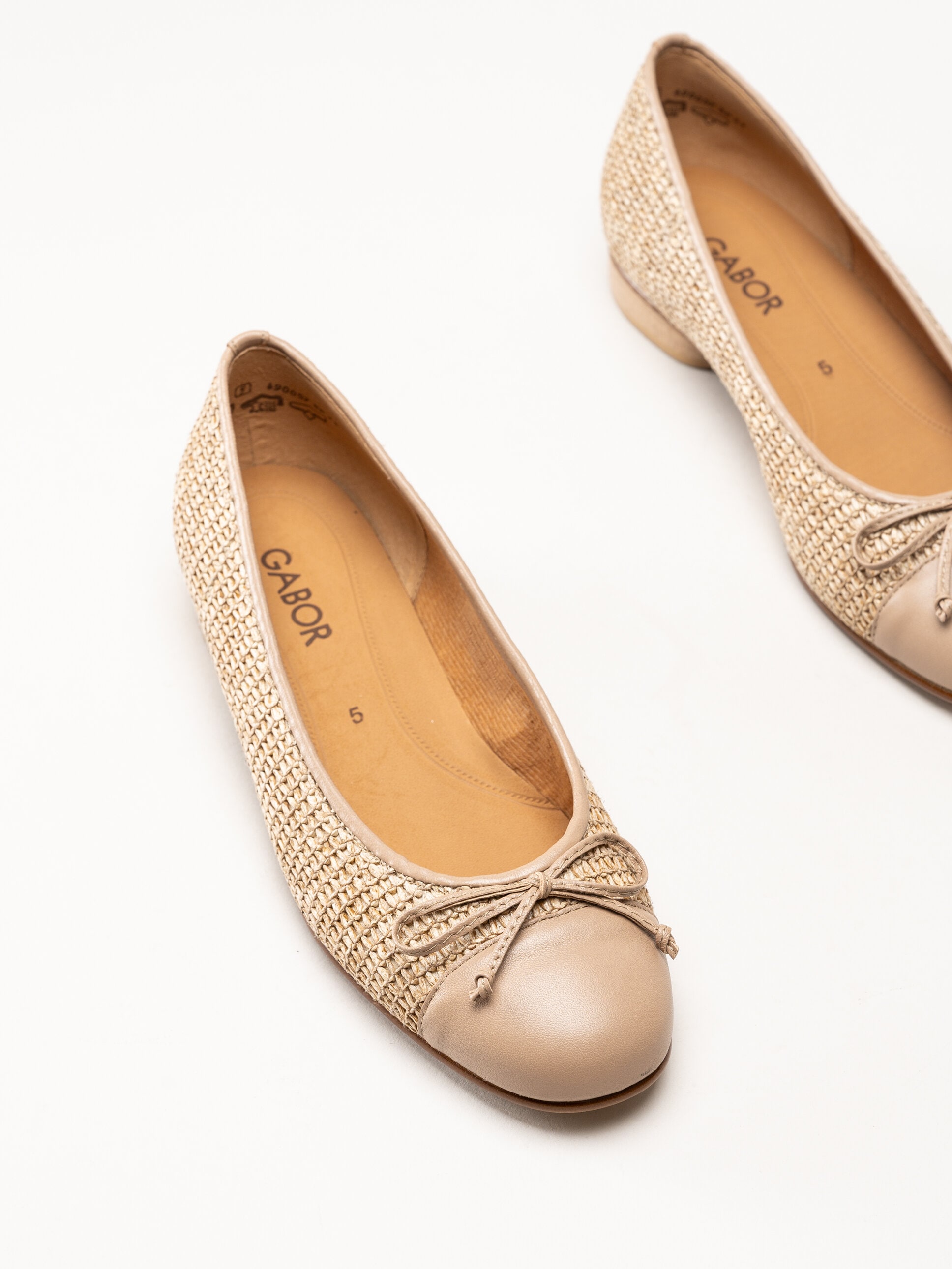 Beige ballerinaskor i skinn från Gabor i färgen Sand. Skorna är tillverkade i en stilfull kombination av skinn och raffia som ger ett naturligt och somrigt uttryck. Den dekorativa rosetten framtill förstärker den feminina designen och ger en elegant finish.