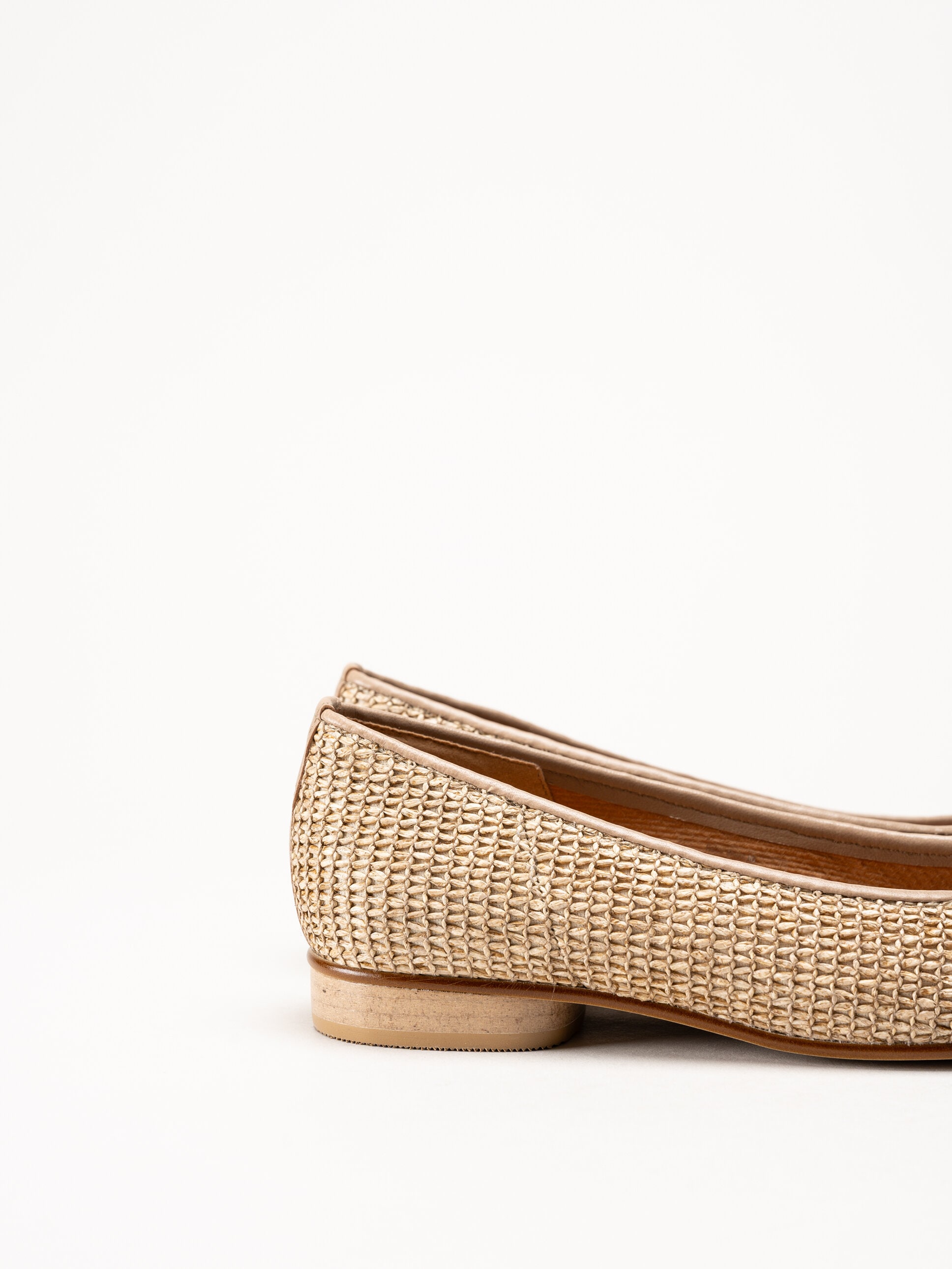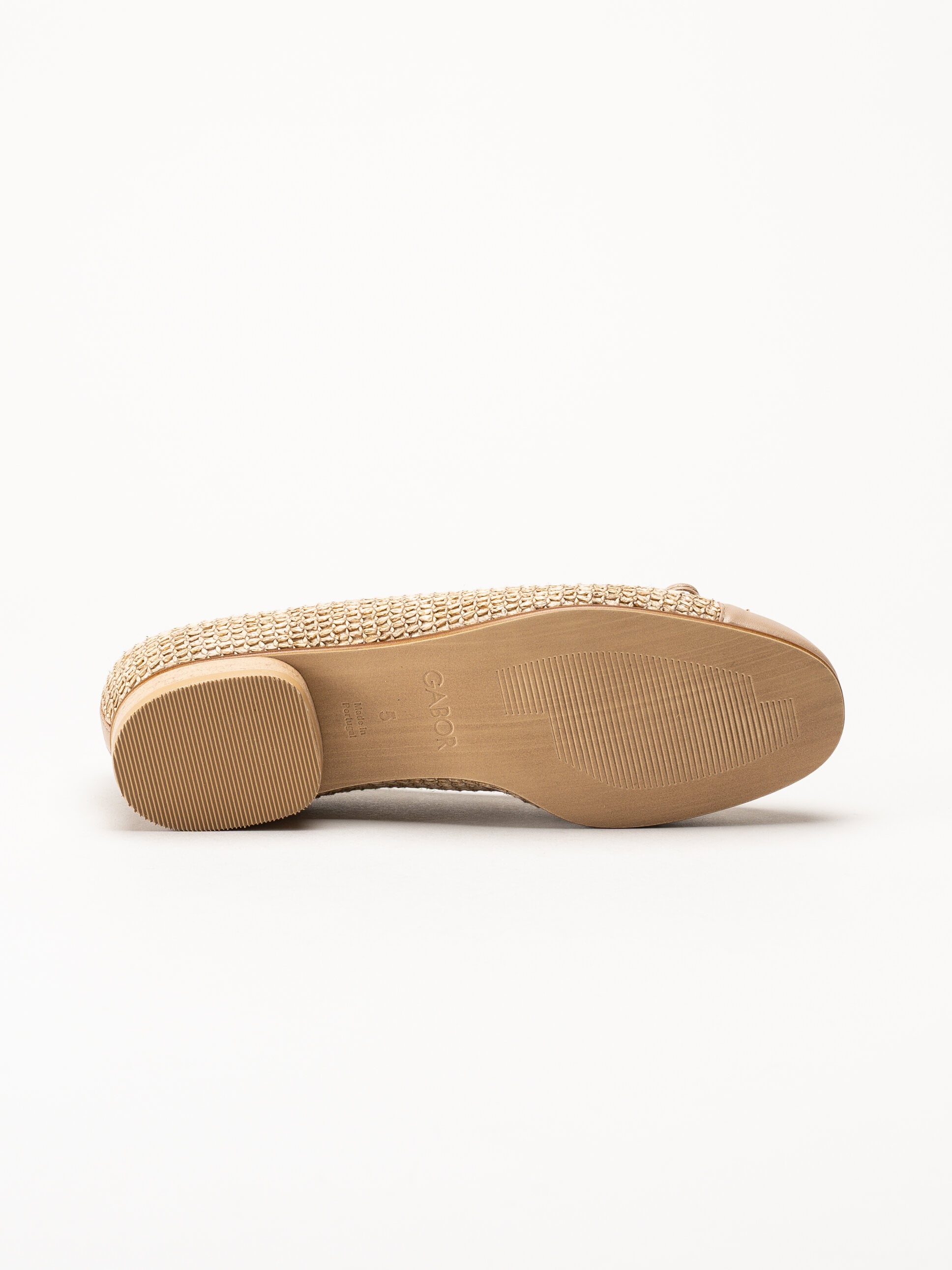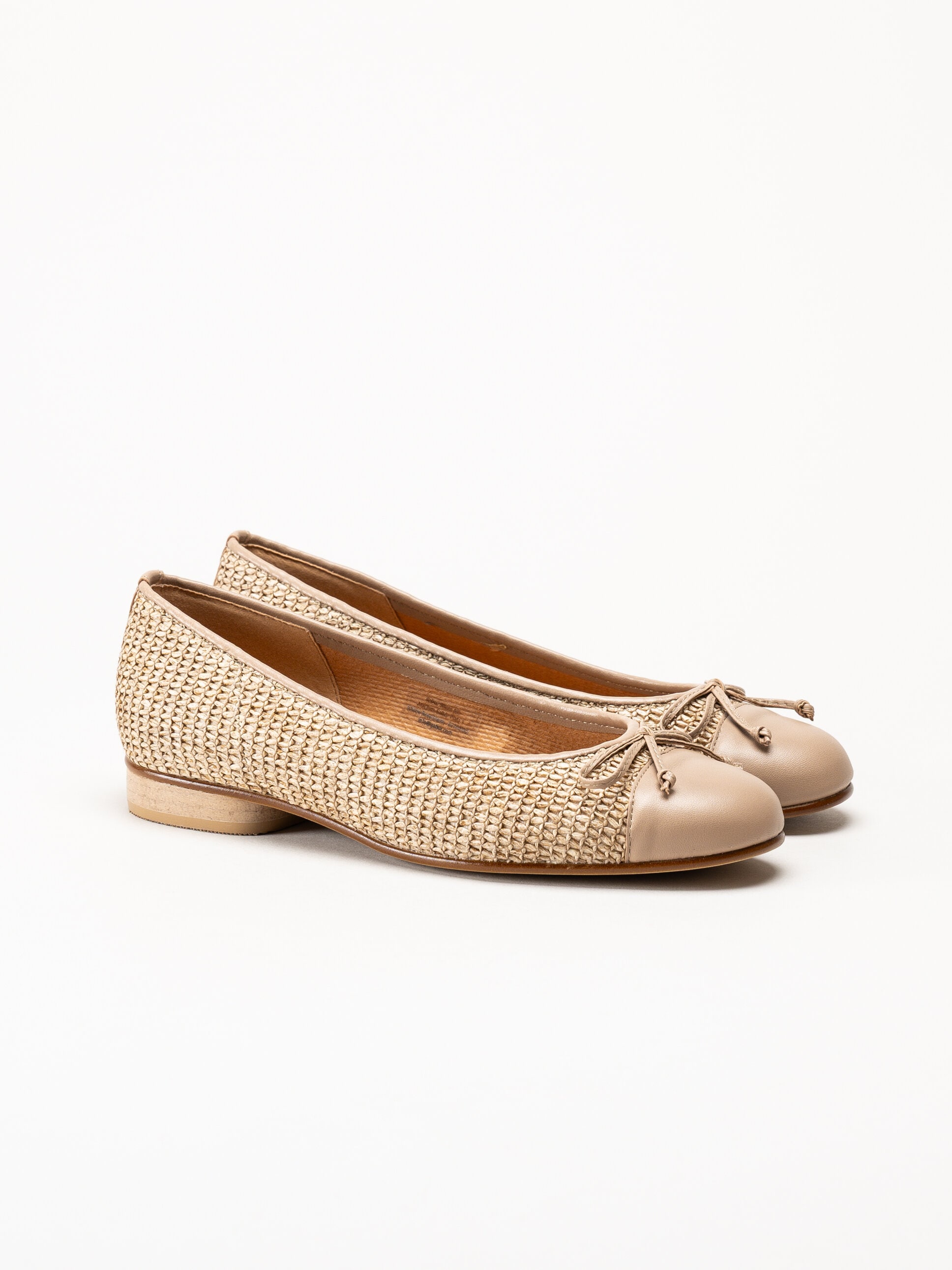 Beige ballerinaskor i skinn från Gabor i färgen Sand. Skorna är tillverkade i en stilfull kombination av skinn och raffia som ger ett naturligt och somrigt uttryck. Den dekorativa rosetten framtill förstärker den feminina designen och ger en elegant finish.