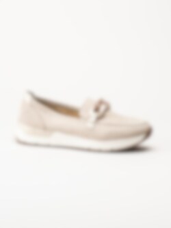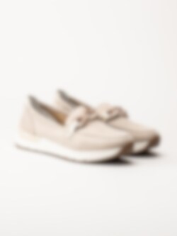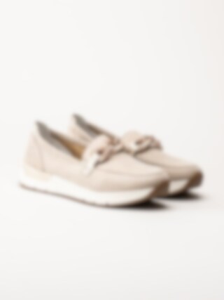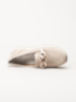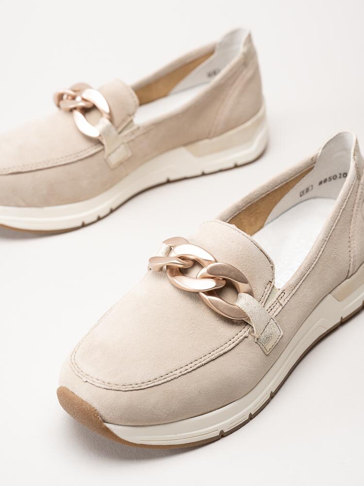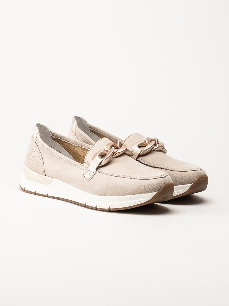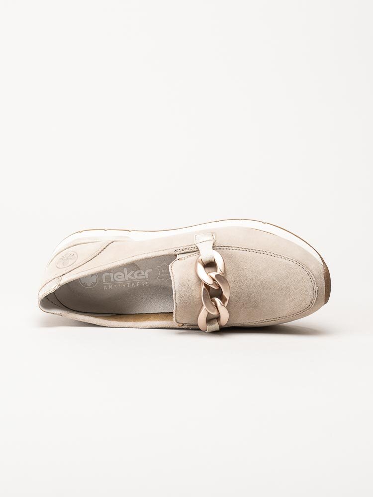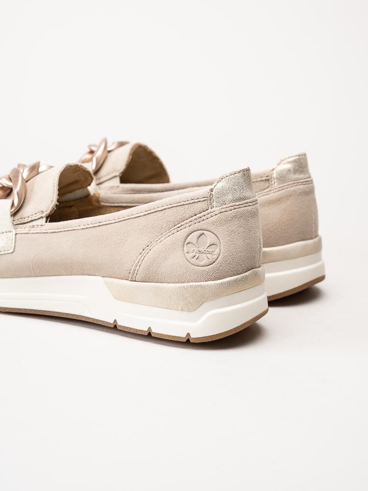 Beige loafers i mocka från Rieker i färgen Iceberg. Skorna är tillverkade i mjuk mocka som ger ett stilrent och elegant uttryck. Den klassiska loafersmodellen kompletteras av ett guldfärgat spänne framtill som tillför en sofistikerad detalj. Med Antistress Rieker får du en lätt, flexibel och stötdämpande sko som är skonsam mot fötterna under hela dagen.