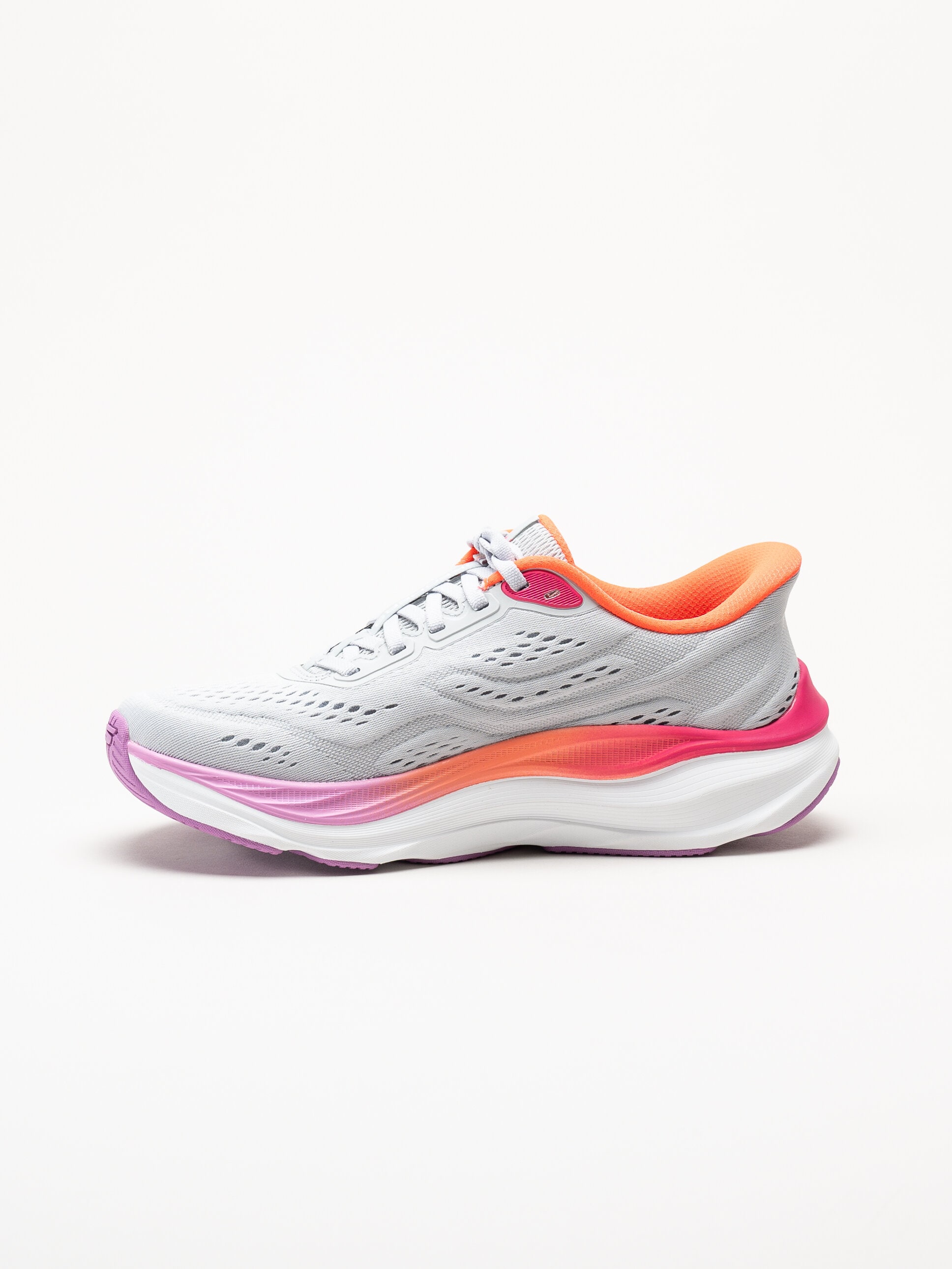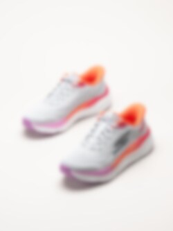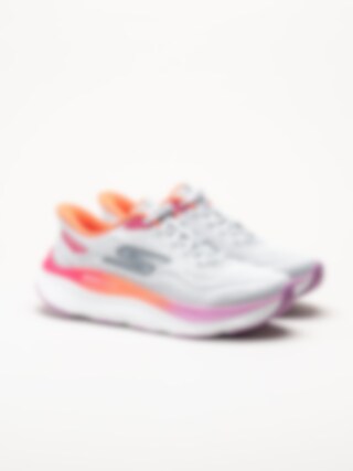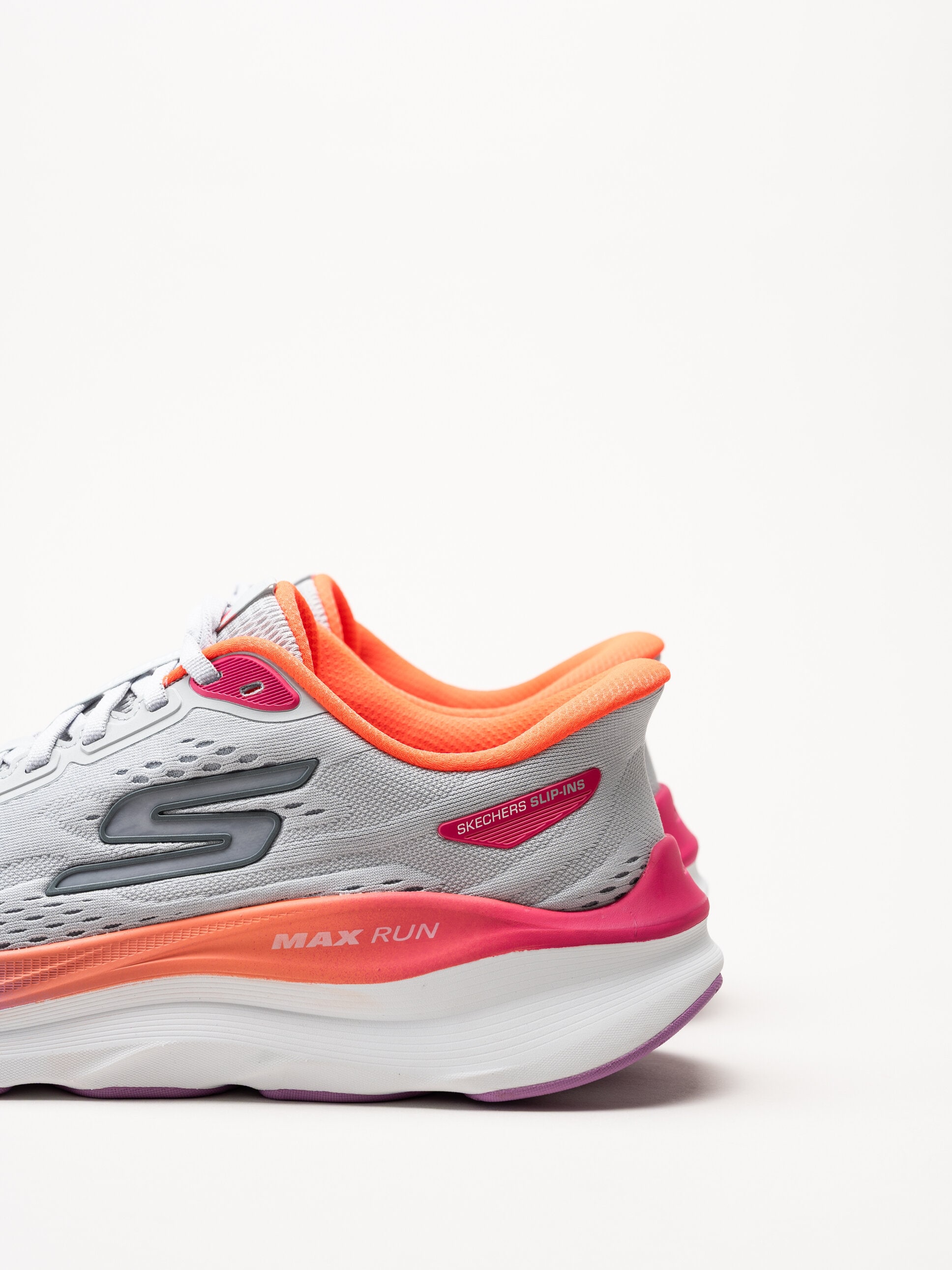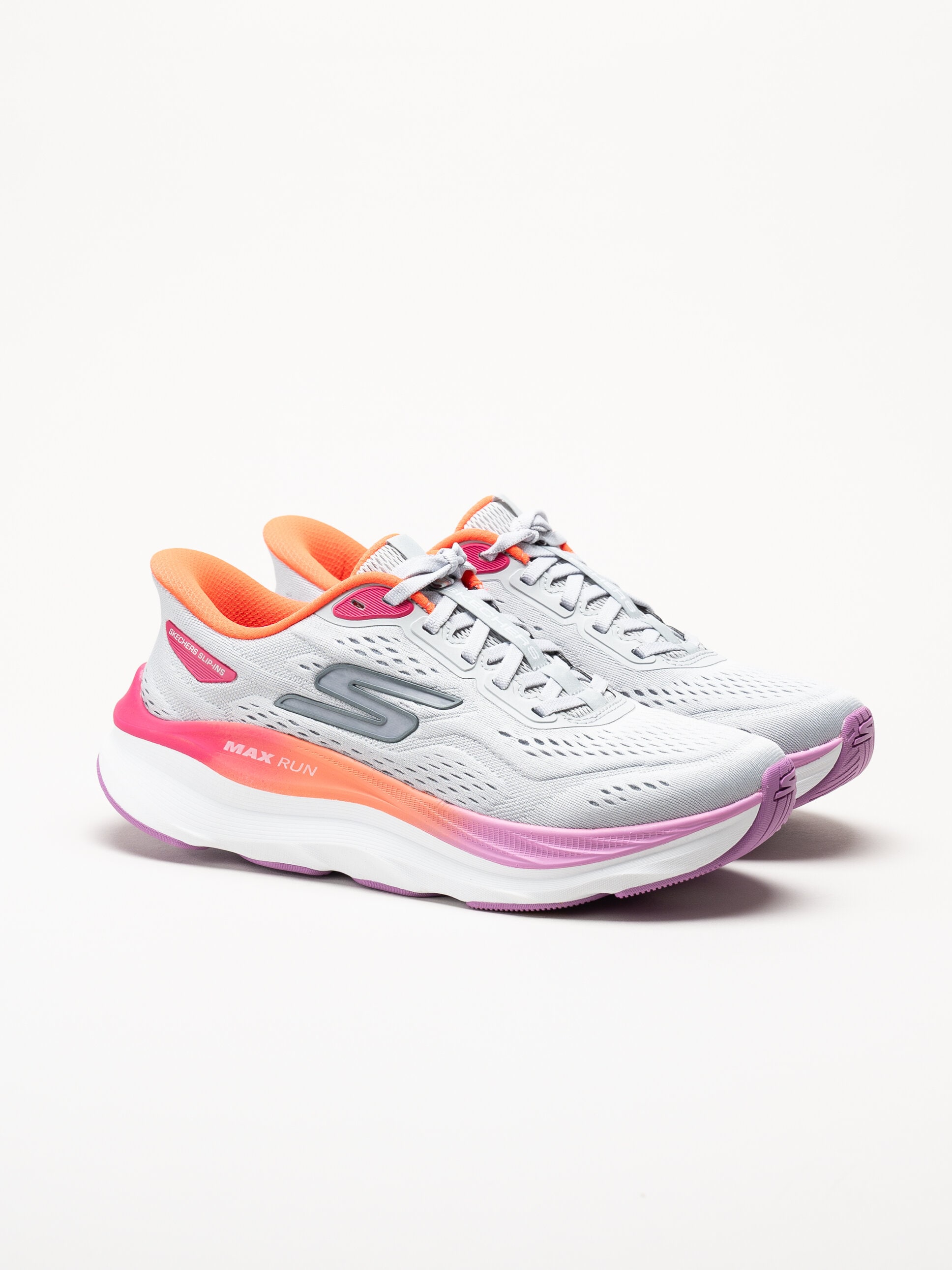 Grå slip-ins sneakers Max Cushioning från Skechers i färgen Gray/Mt. Skorna är tillverkade i ventilerande mesh som ger en lätt och luftig känsla under hela dagen. Den smarta Hands Free Slip-Ins®-designen gör dem enkla att ta på utan att använda händerna, samtidigt som snörningen ger en justerbar och säker passform. De färgade detaljerna ger en modern och sportig look.