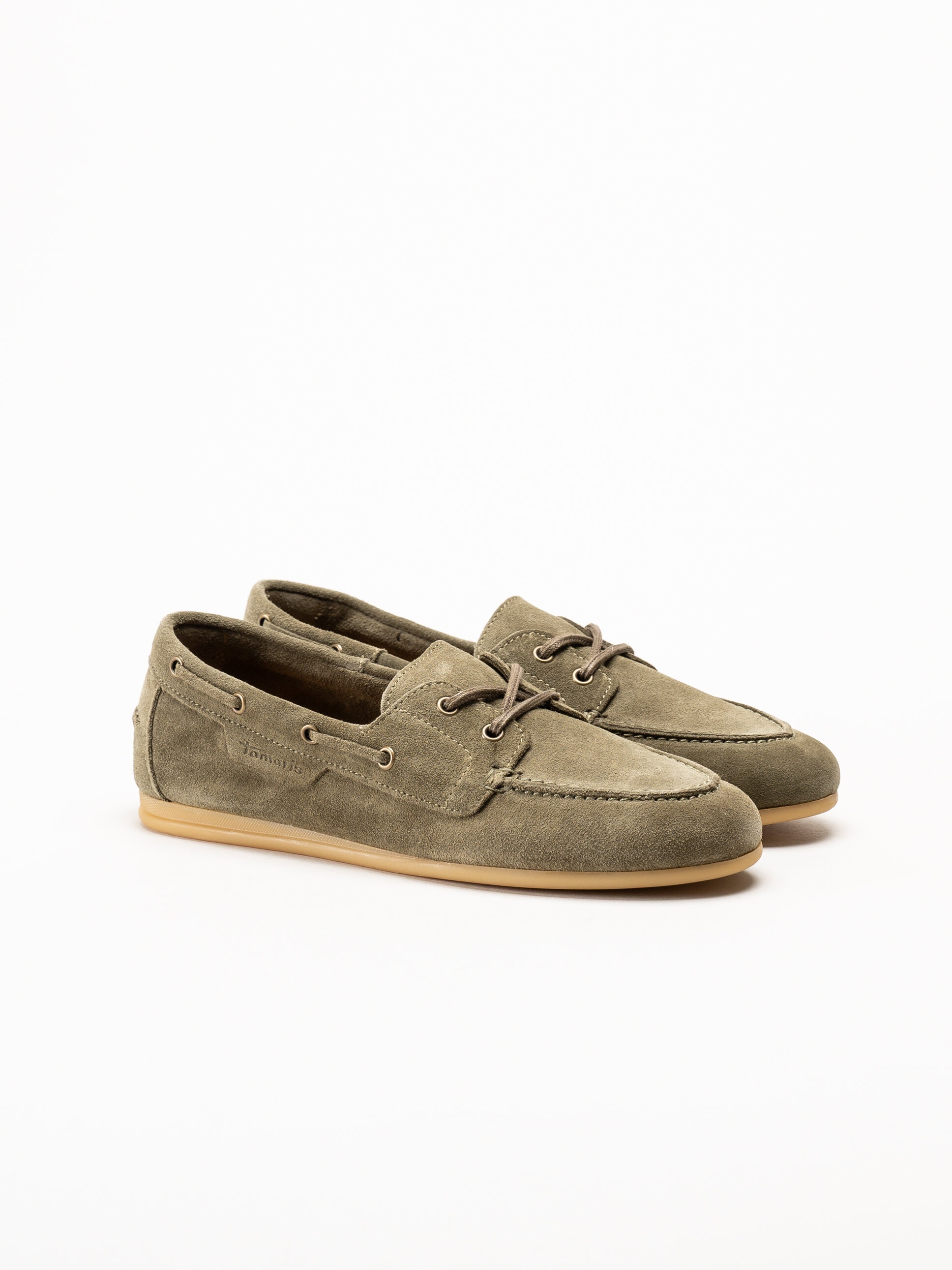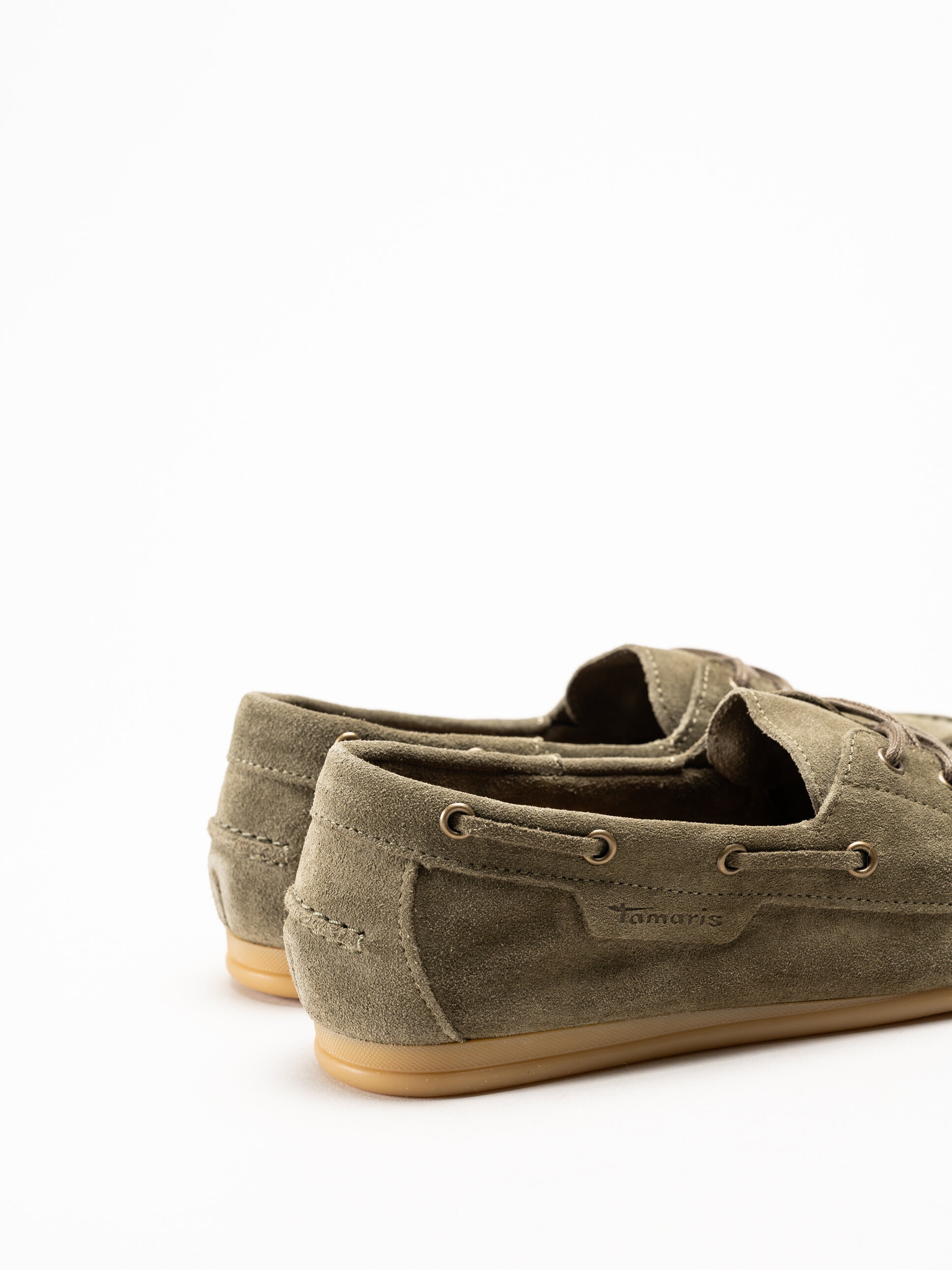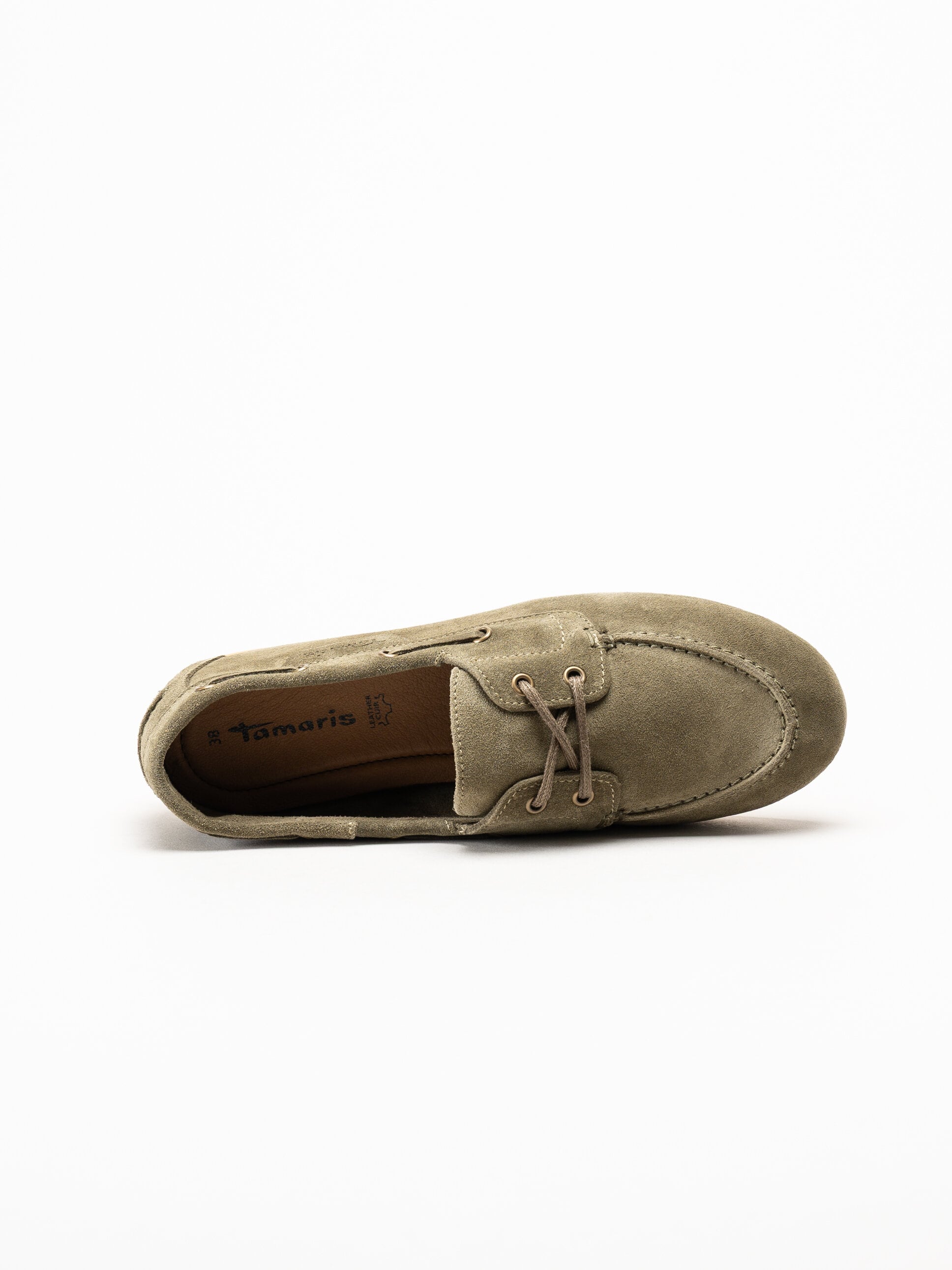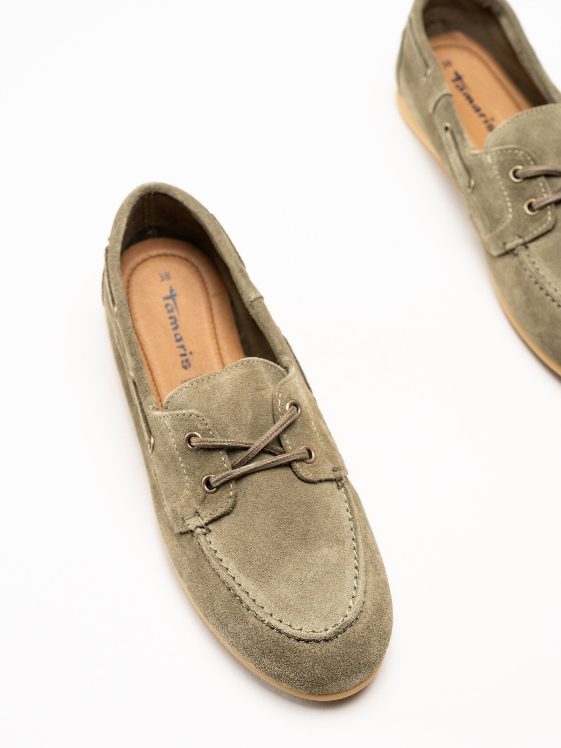 Gröna loafers i mocka från Tamaris i färgen Olive. Skorna är tillverkade i mjuk mocka som ger ett stilrent och klassiskt uttryck med en tidlös loafersilhuett. Den dekorativa snörningen framtill förstärker den traditionella designen och bidrar med en subtil detalj.