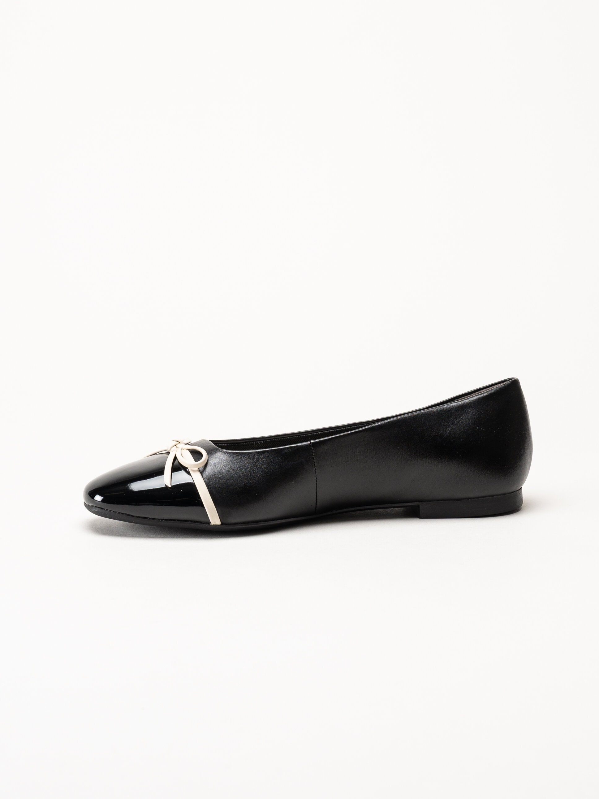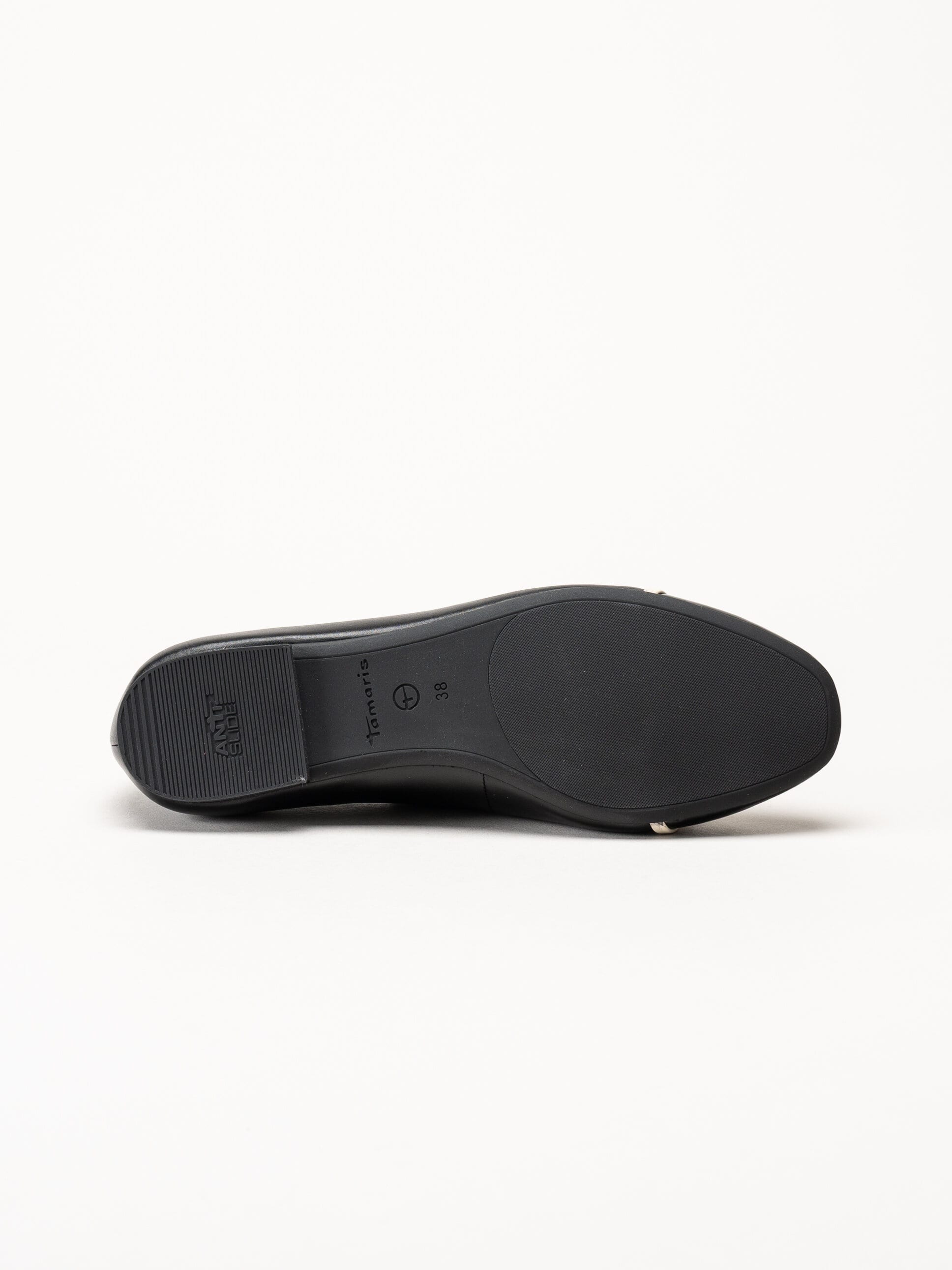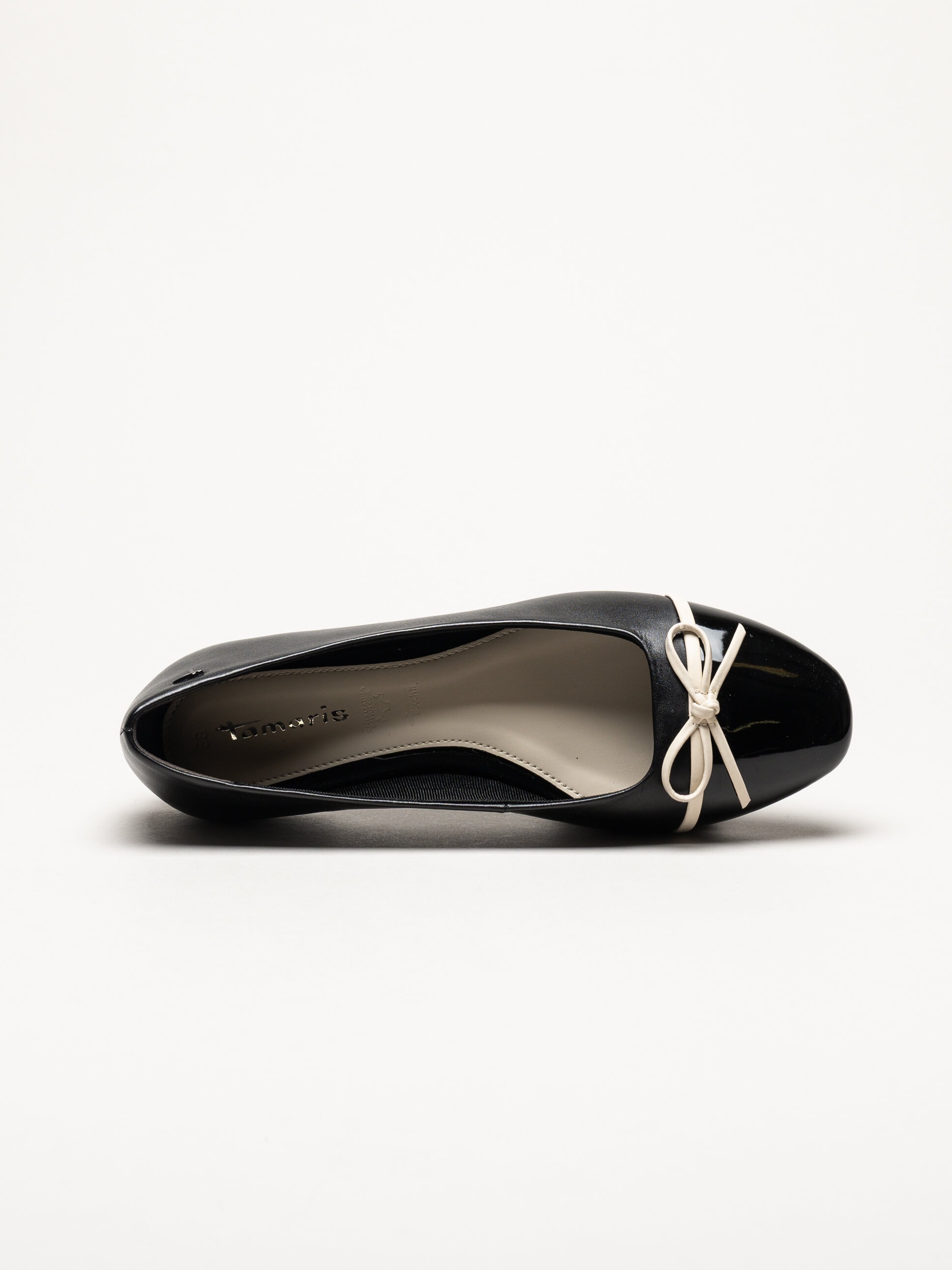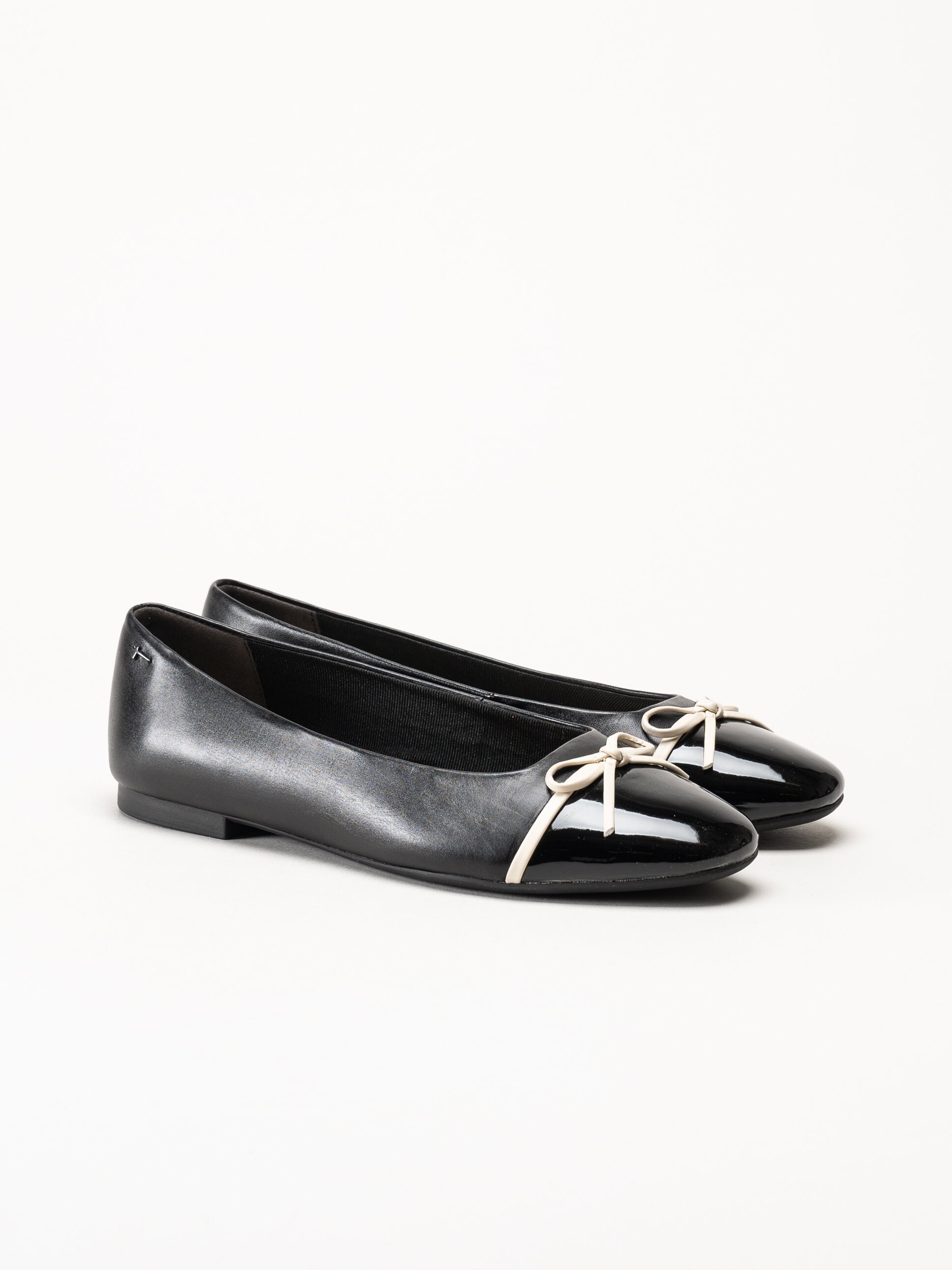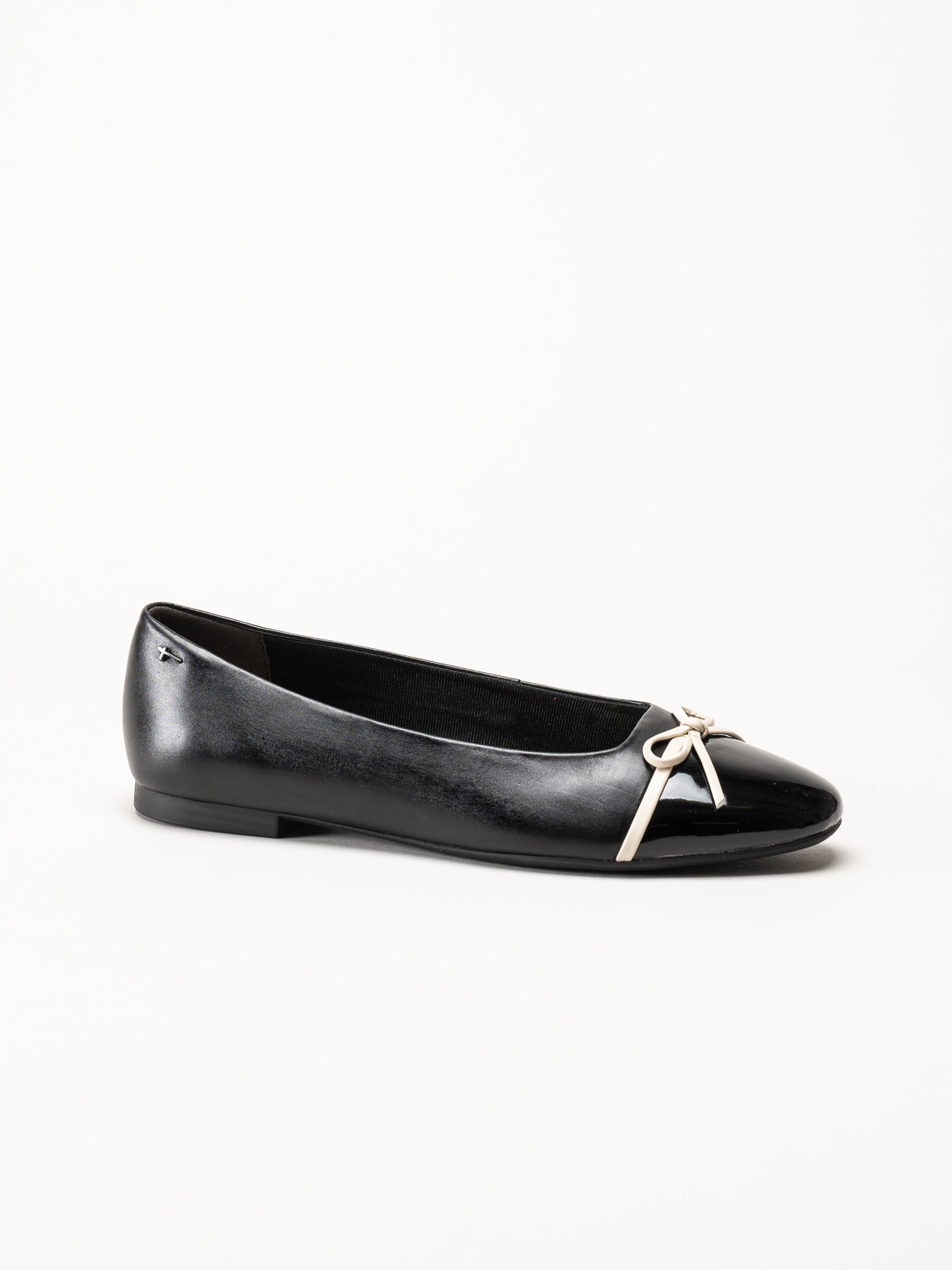 Svarta ballerinaskor i skinn från Tamaris i färgen Black Comb. Skorna är tillverkade i mjukt skinn med lack- och syntetdetaljer som ger ett elegant och tidlöst intryck, perfekt för både vardag och mer uppklädda tillfällen. Den klassiska silhuetten kompletteras av en dekorativ rosett framtill.