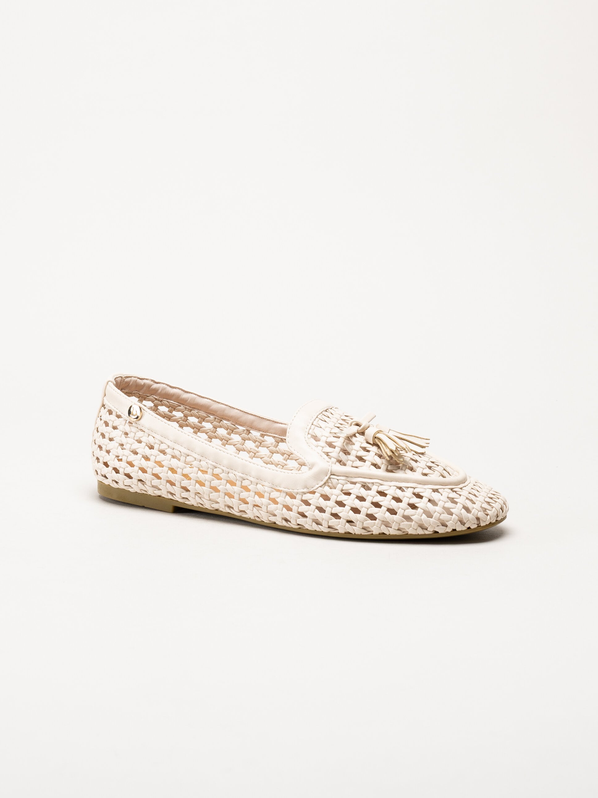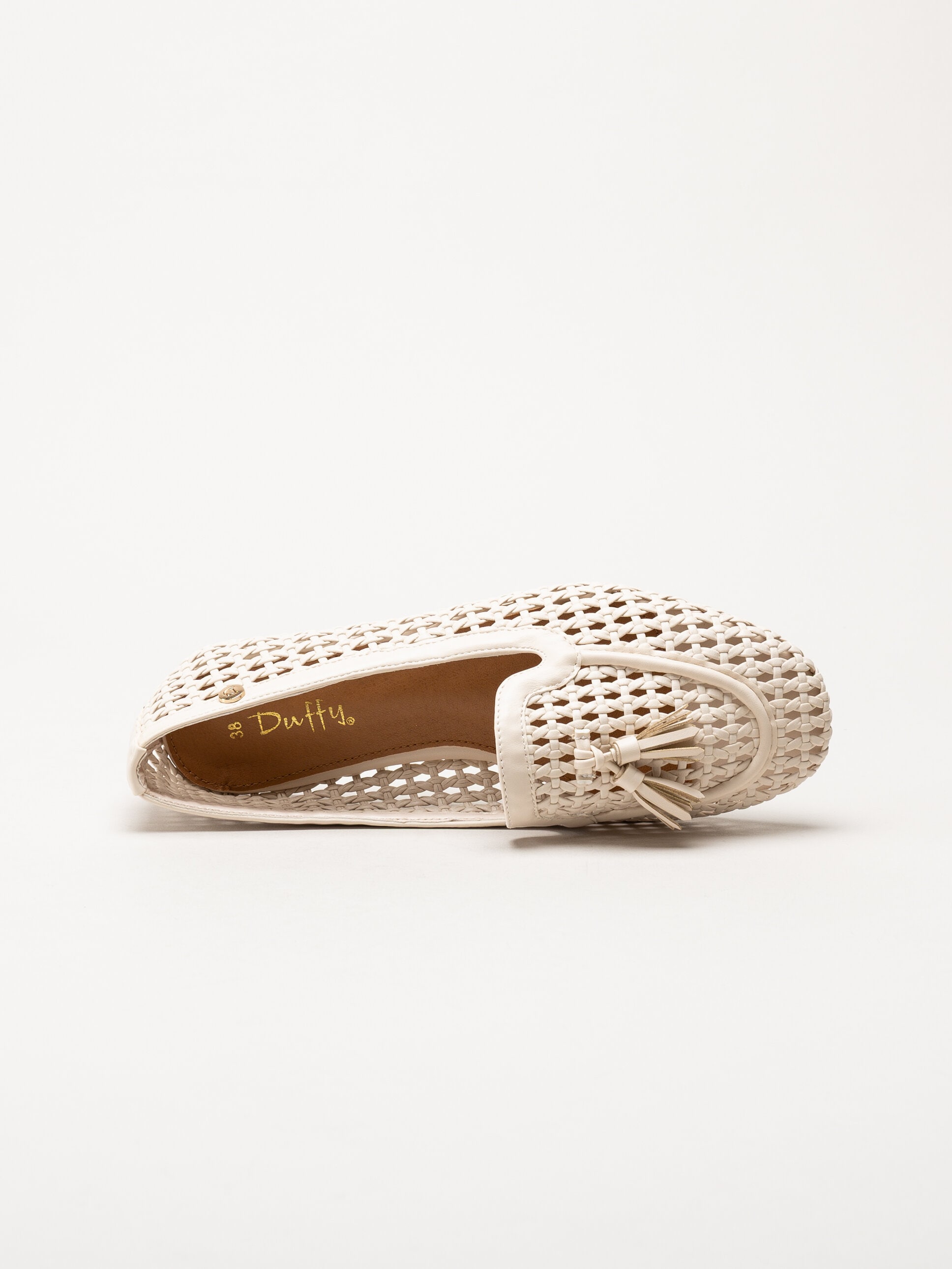 Beige flätad loafers från Duffy. Skorna är tillverkade i syntet med ett flätat mönster som ger ett stilrent och somrigt uttryck. Den klassiska loafer-modellen kompletteras av en dekorativ tofs framtill som tillför en elegant och feminin detalj.