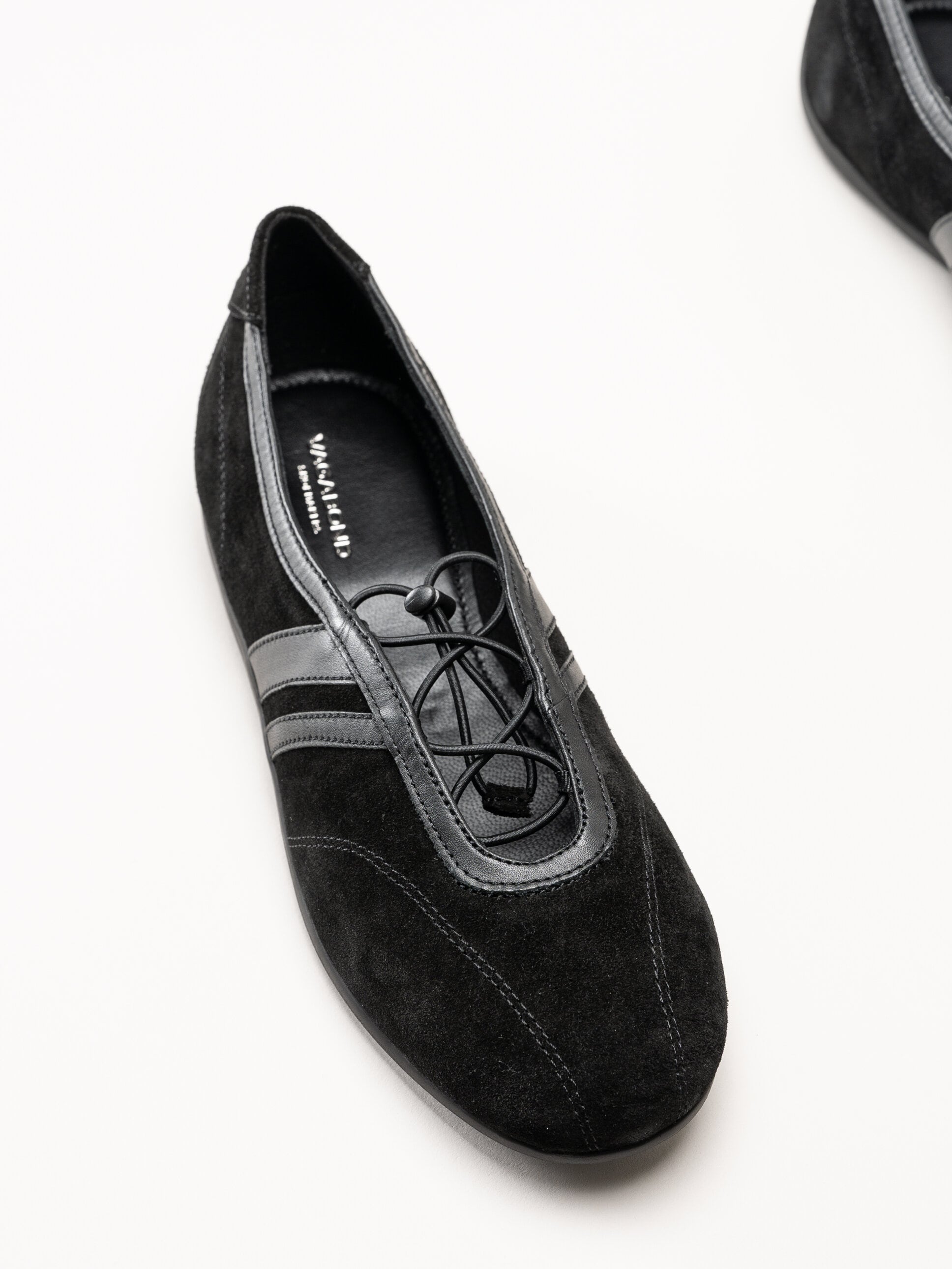 Svarta sportiga ballerinaskor i mocka Hollie från Vagabond i färgen Black. Skorna är tillverkade i en kombination av mjuk mocka och skinn som ger ett stilrent och sportigt uttryck. Den praktiska snabbsnörningen med dragsko gör det enkelt att justera passformen och ger en säker och bekväm känsla under hela dagen.