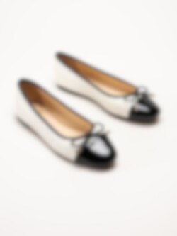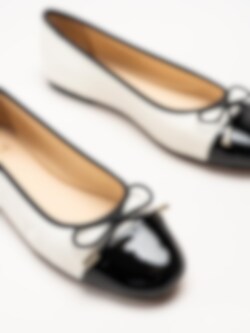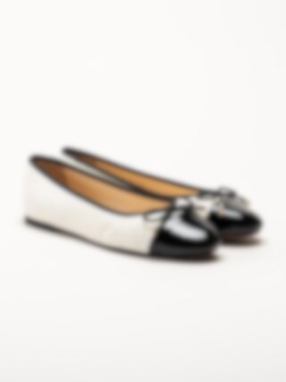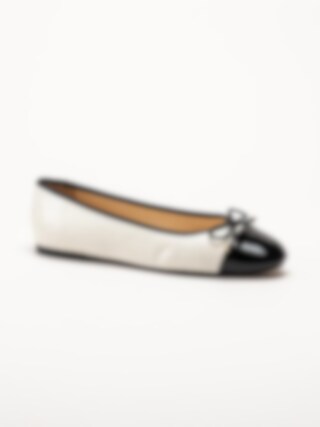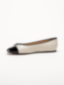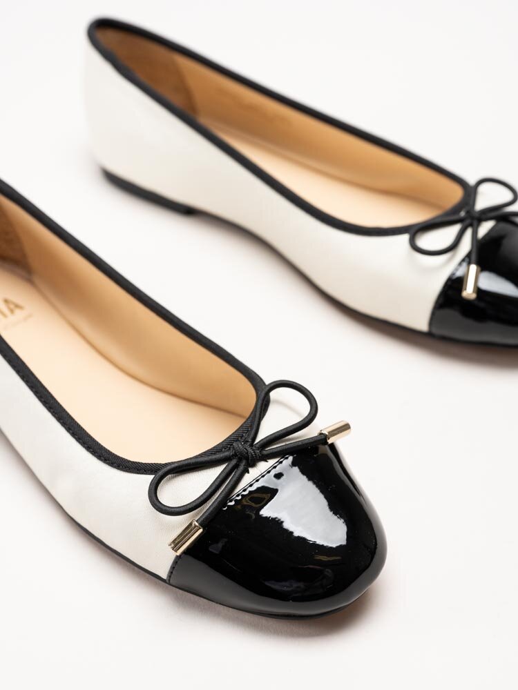 Vita ballerinaskor i skinn Cate från Dasia. Skorna är tillverkade i en kombination av skinn, lack och syntet som ger en elegant och följsam känsla. Det svarta tåpartiet i skinnlack och den dekorativa rosetten framtill tillför stilrena och feminina detaljer.