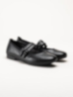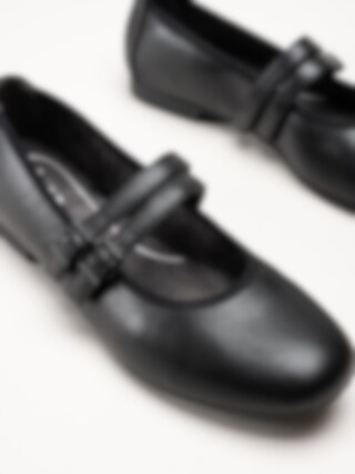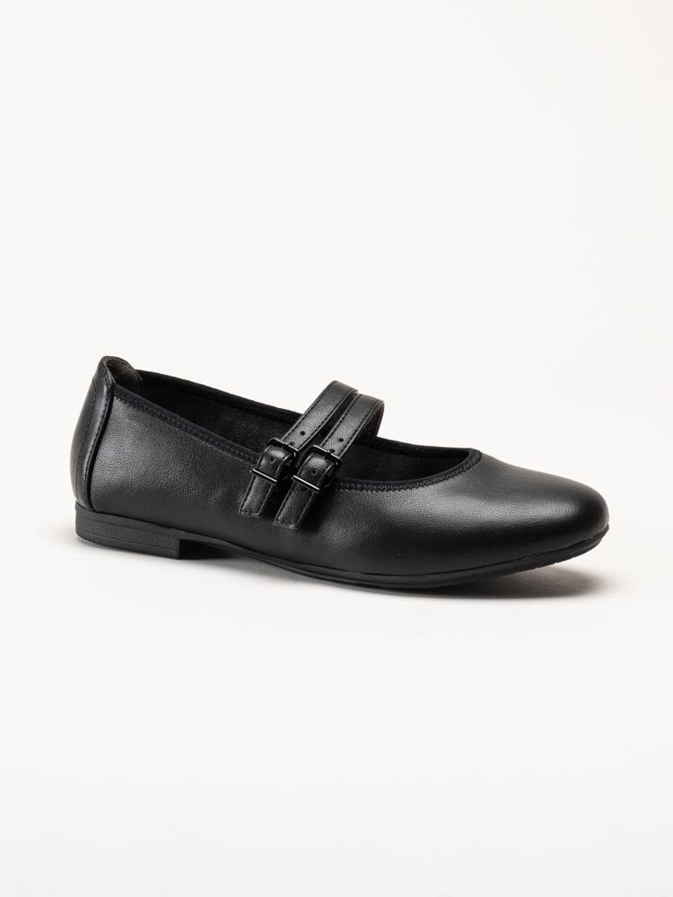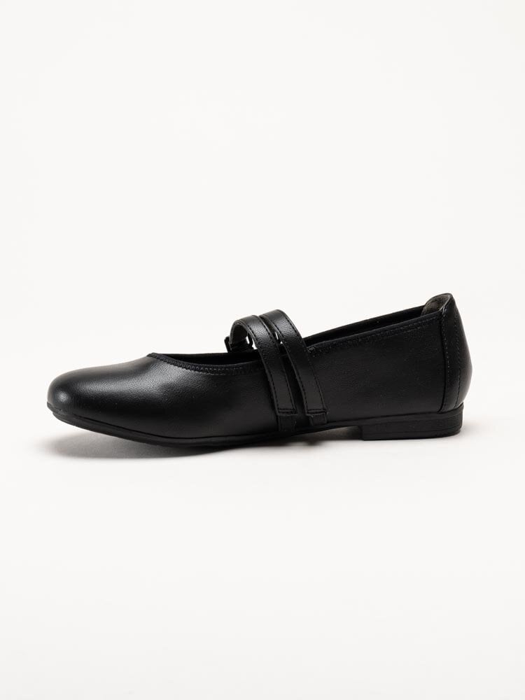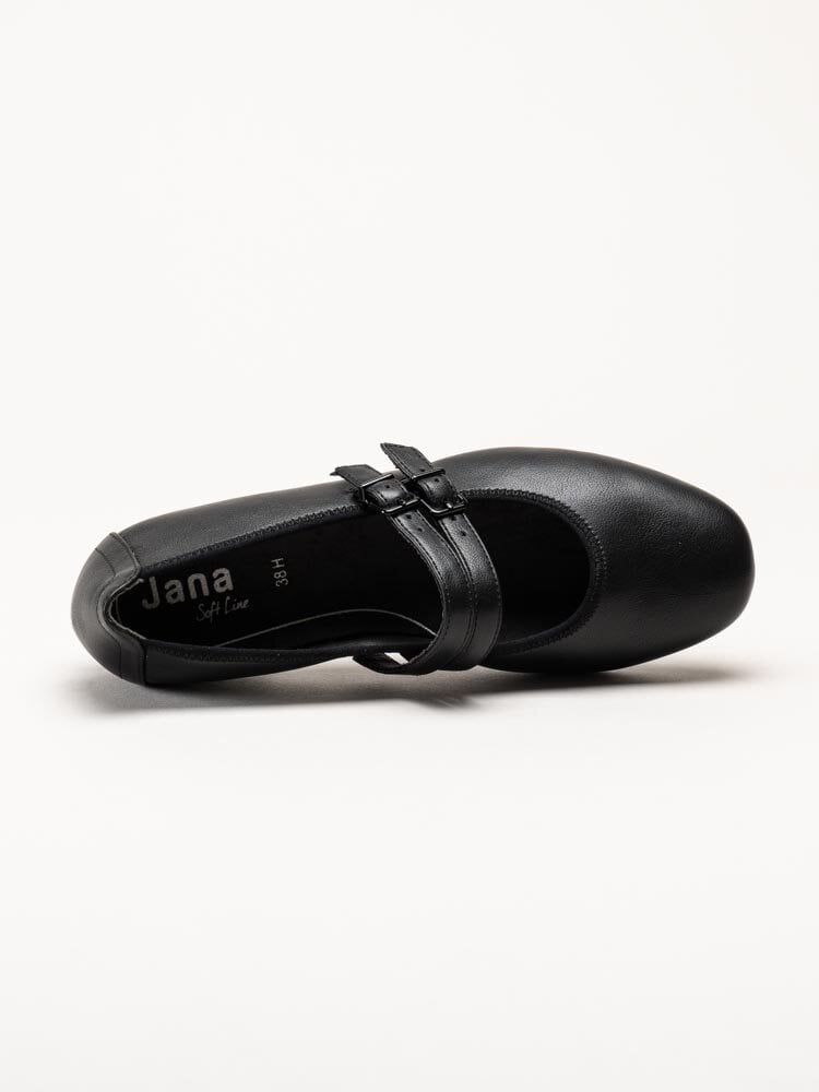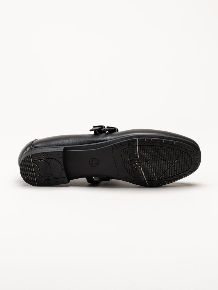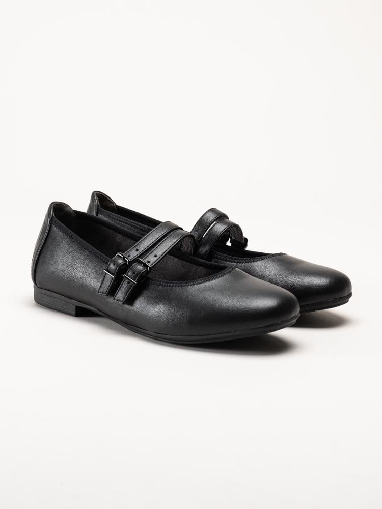 Svarta ballerinaskor från Jana. Skorna är tillverkade i syntet som ger ett stilrent och lättskött utseende. Modellen har två dekorativa slejfar med justerbara spännen som gör det enkelt att anpassa passformen efter foten. Invändigt är skorna fodrade med textil, och innersulan i textil ger en mjuk och behaglig känsla under hela dagen.
