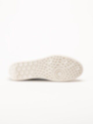 Den vita tåhättan i skinn tillsammans med den matchande yttersulan skapar en modern kontrast till den beige mockan och bidrar med både slitstyrka, stabilitet och bra grepp i vardagen.