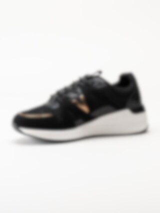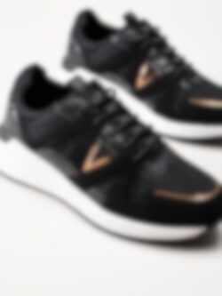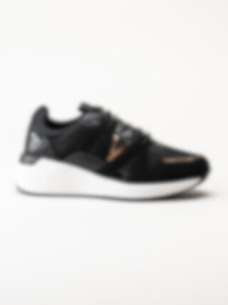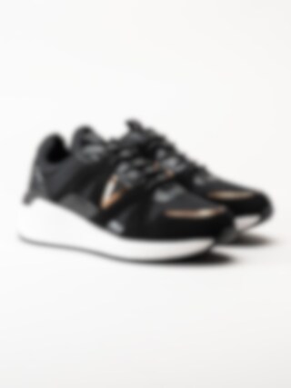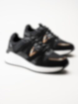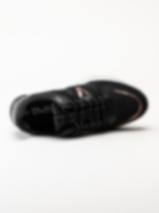 Svarta kilklackade sneakers i textil och syntet från Duffy. Sneaker med både snörning och dragkedja framtill. Dragkedjan gör skon smidig att ta av och på. Snygga detaljer i guld och partier i krokomönster. Yttersulan är något högre baktill än framtill och är som högst 55 mm.