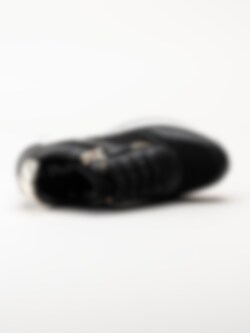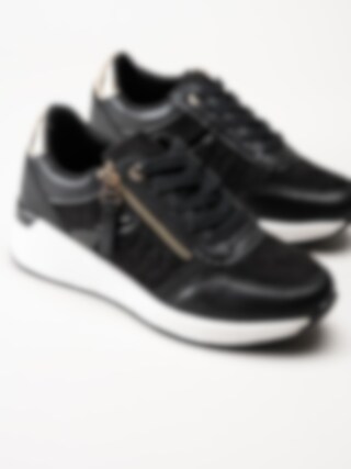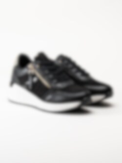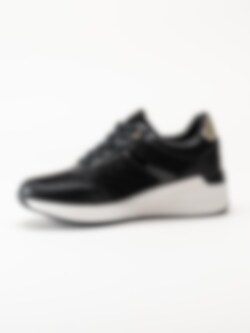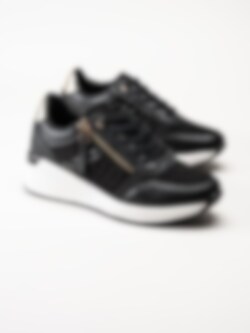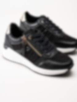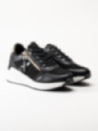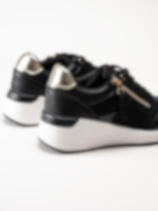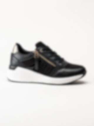 Svarta kilklackade sneakers i textil och syntet från Duffy. Sneaker med både snörning och dragkedja framtill. Dragkedjan gör skon smidig att ta av och på. Snygga gulddetaljer i både dragkedja och baktill. Yttersulan är något högre baktill än framtill och är som högst 55 mm.
