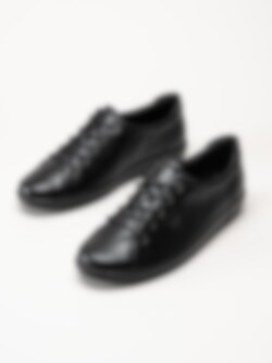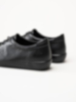 Svarta snörskor Soft 2.0 från Ecco tillverkade i skinn. Präglad logga på ovansidan och på sulkanten. Svart snörning i vaxad bomull på 5 hål med öljetter i svart. Svart foder och löstagbar innersula i textil. Låg kilklack på ca 3 cm för att komma upp en aning. Svart yttersula i syntet med randigt mönster och logga. En nätt och diskret allroundmodell, lätt att matcha med ett par jeans eller shorts om vädret tillåter.