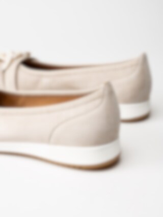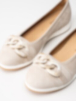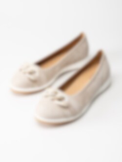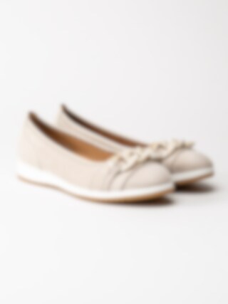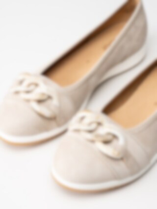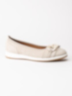 Ljusbeige ballerina i mocka från Gabor. Sköna ballerinaskor med löstagbar innersula i skinn. Dekorativt beigefärgat spänne på ovansida.