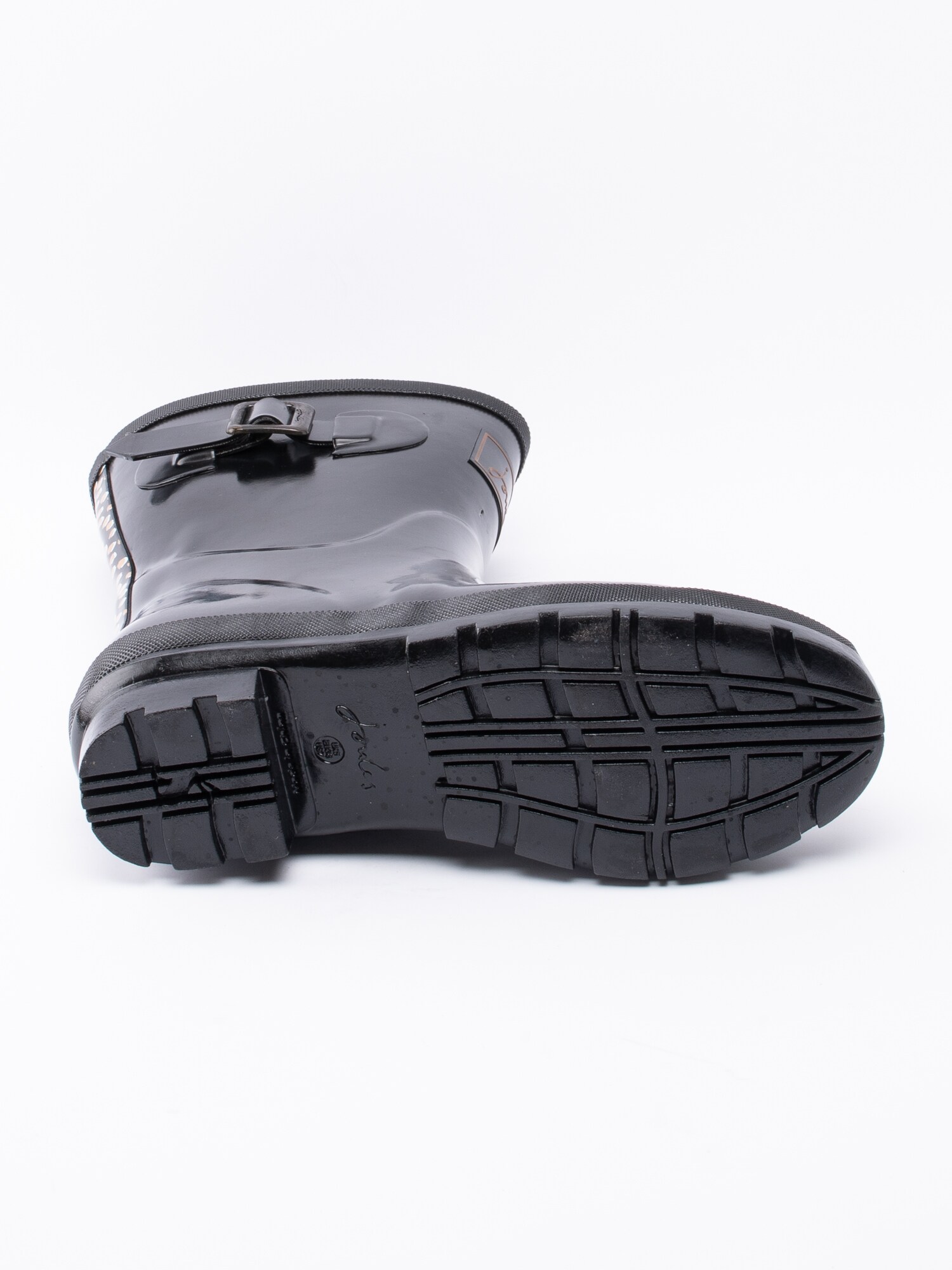 Gummistövel Kelly Gloss Welly från Joules är en svart gummistövel i naturgummi med glansig yta. Rand med mönster längs bakparti. Dekorativ rem med spänne på utsidan. Präglad logga på framsidan av skaftet. Förstärkt kant längs skaftet och sulan. Svart mönstrat foder och löstagbar innersula i textil. Svart yttersula i gummi med grovt mönster och logga.