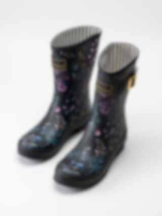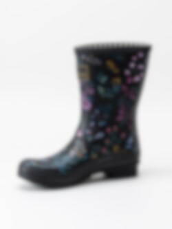 Svarta gummistövlar Molly Welly tillverkade i naturgummi som är både slitstarkt och har god elasticitet. Svart botten med ett härligt blommönster över hela stöveln. Modell som passar både till city som till trädgården. Svart yttersula i gummi.