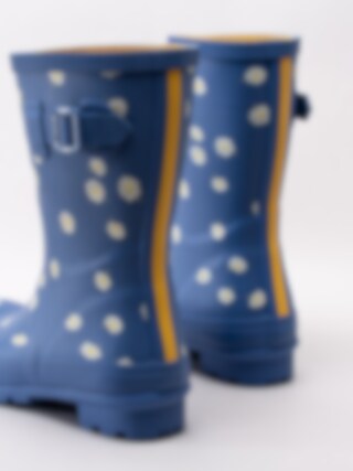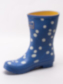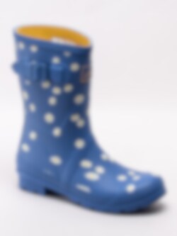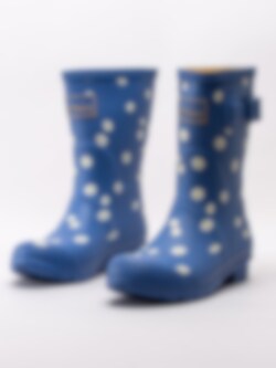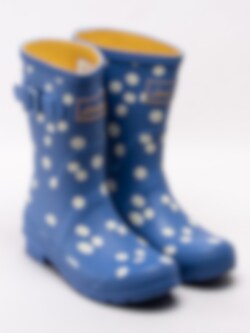 Blå gummistövlar Molly Welly från Joules tillverkade i naturgummi som är både slitstakt och har god elasticitet. Mellanhög modell som passar både till city som till trädgården. Prästkragar som framhäver den blå stöveln. Löstagbar innersula i textil som gör att stöveln passar att användas som bäst i mildare temperaturer.