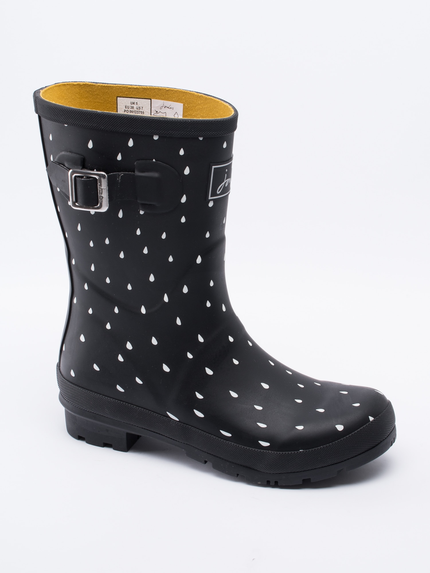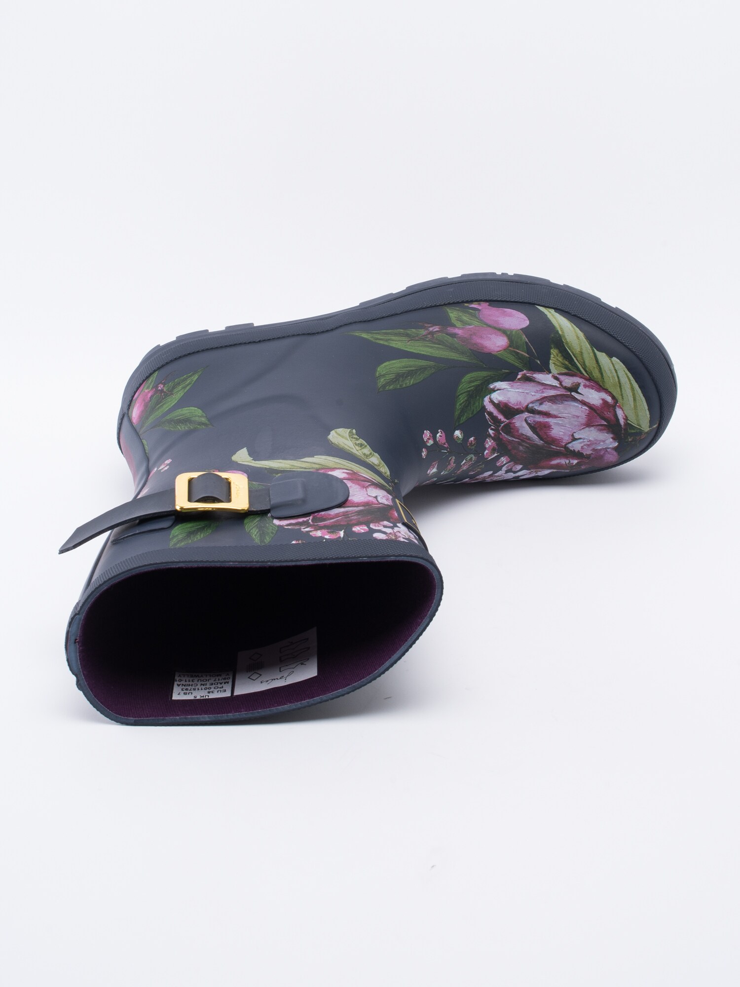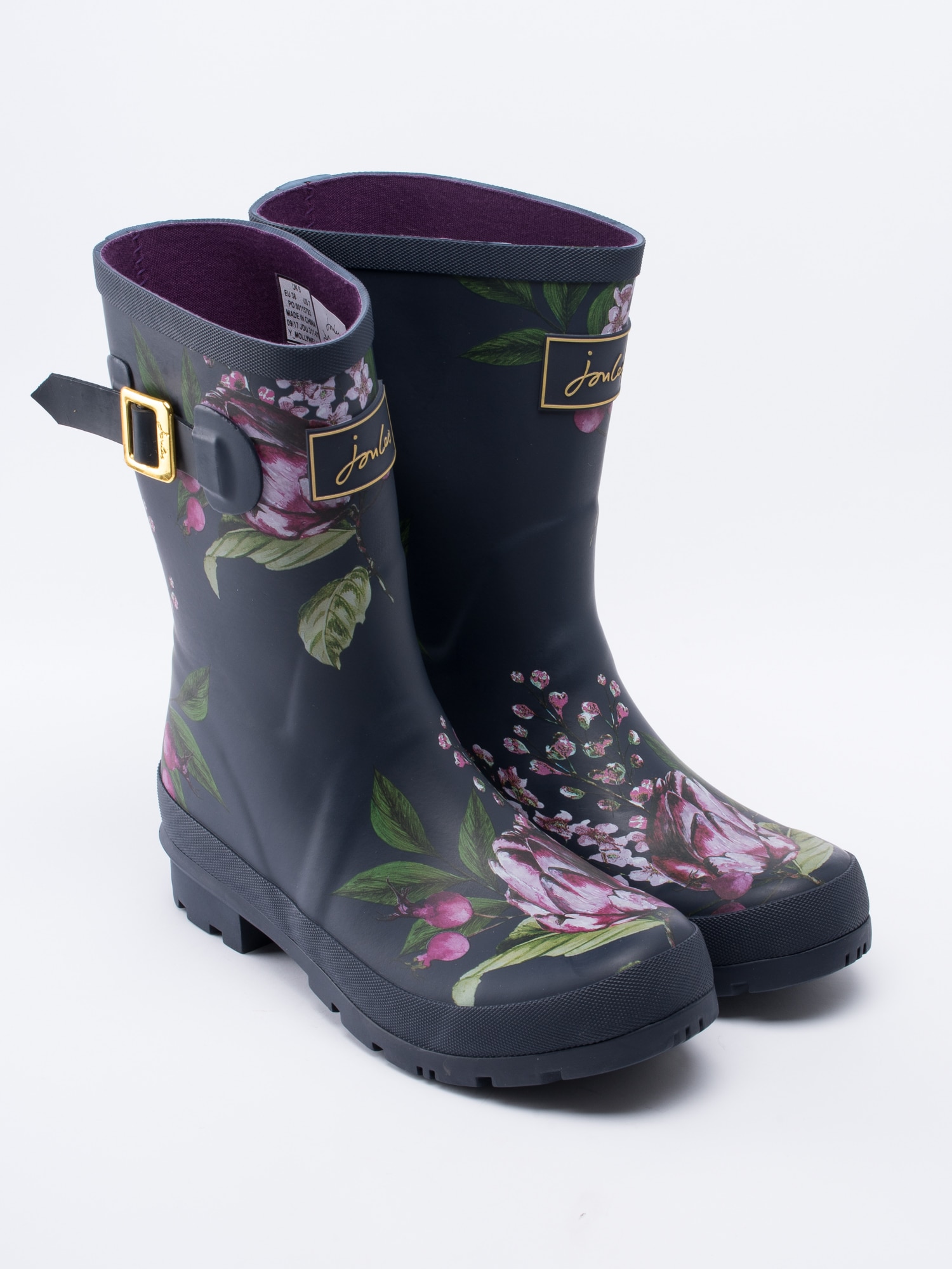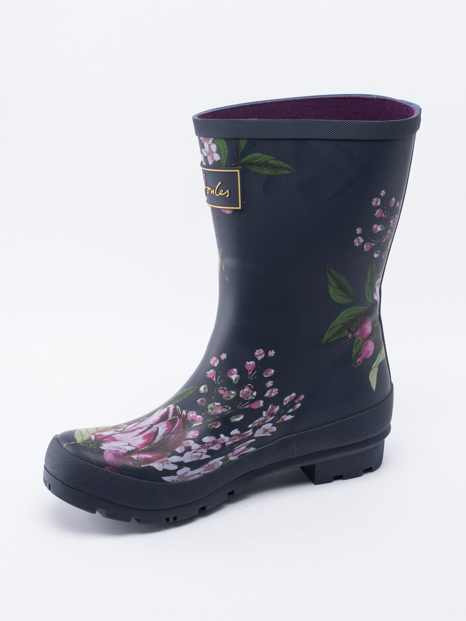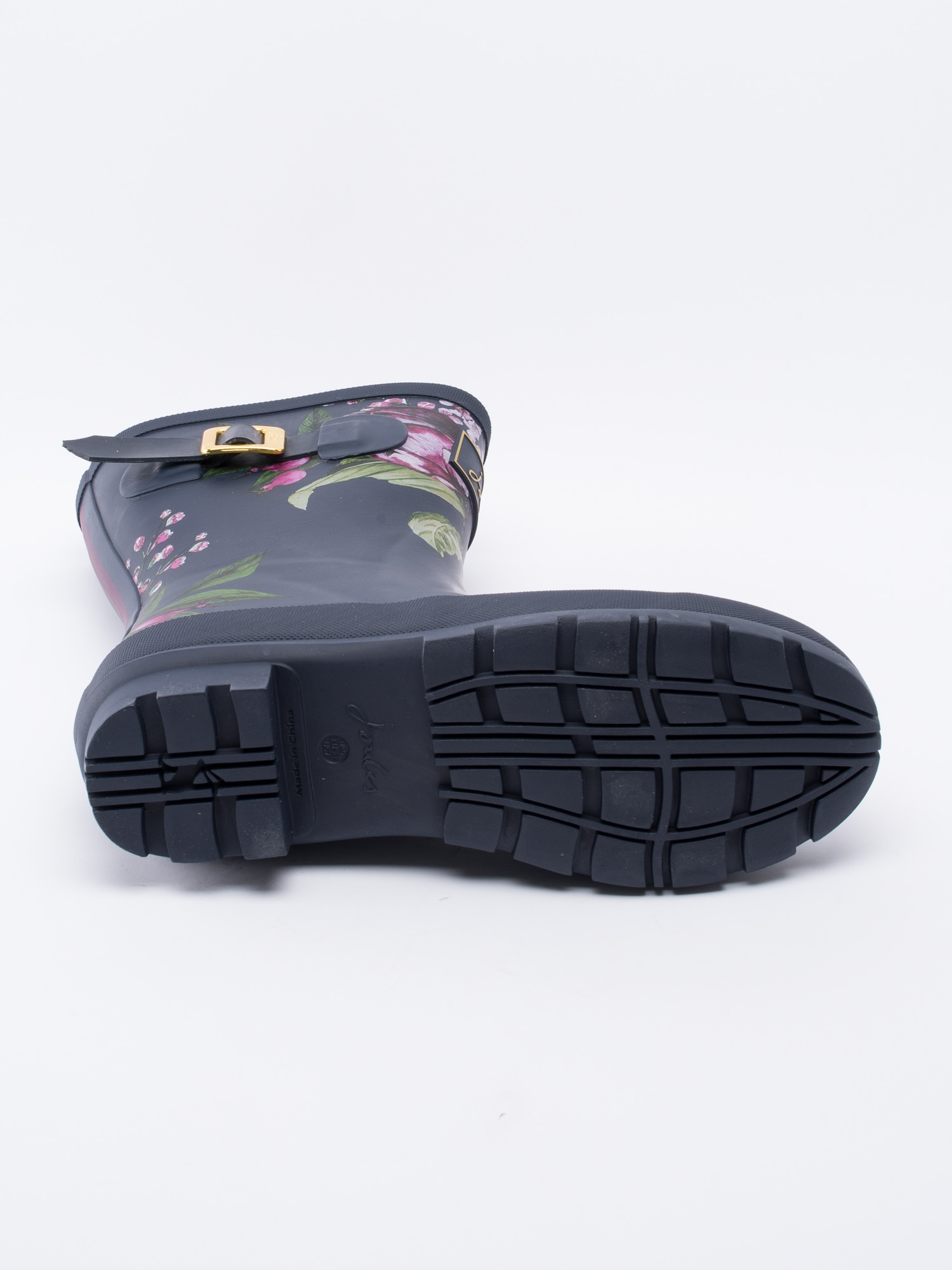 Gummistövel Molly Welly Mid Height Printed från Joules är en mörkblå, halvhög gummistövel tillverkad i naturgummi. Mönster med lila blommor som detalj. Gul logga på främre delen av skaftet. Rem på utsidan med guldspänne som detalj. Foder och löstagbar innersula i textil. Mörkblå yttersula i gummi med randigt mönster och logga.