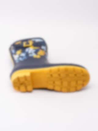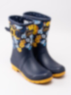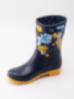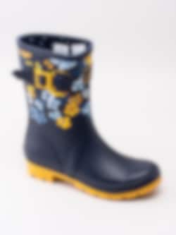 Gummistövel Molly Welly från Joules tillverkad i mörkblå naturgummi med ljusblåa och gula blommor. Gul präglad logga på framsidan av skaftet. Dekorativ rem med gult spänne på utsidan. Förstärkt kant längs skaftkant och sulan. Mörkblått foder och löstagbar innersula i textil. Låg klack på ca 3.5 cm. Gul yttersula i gummi med randigt mönster och logga.