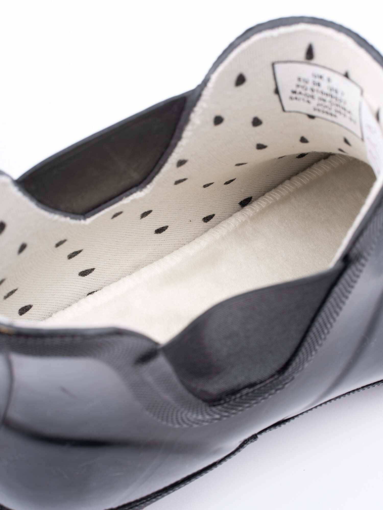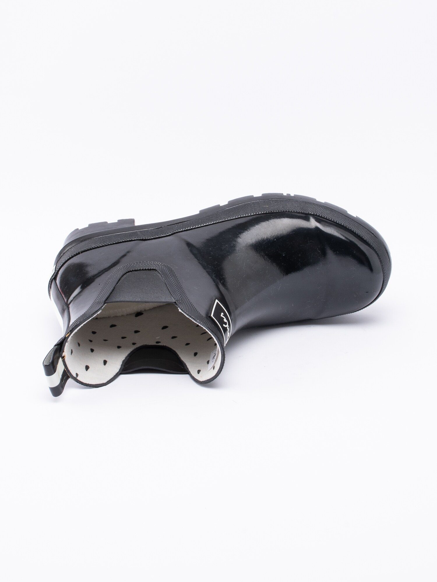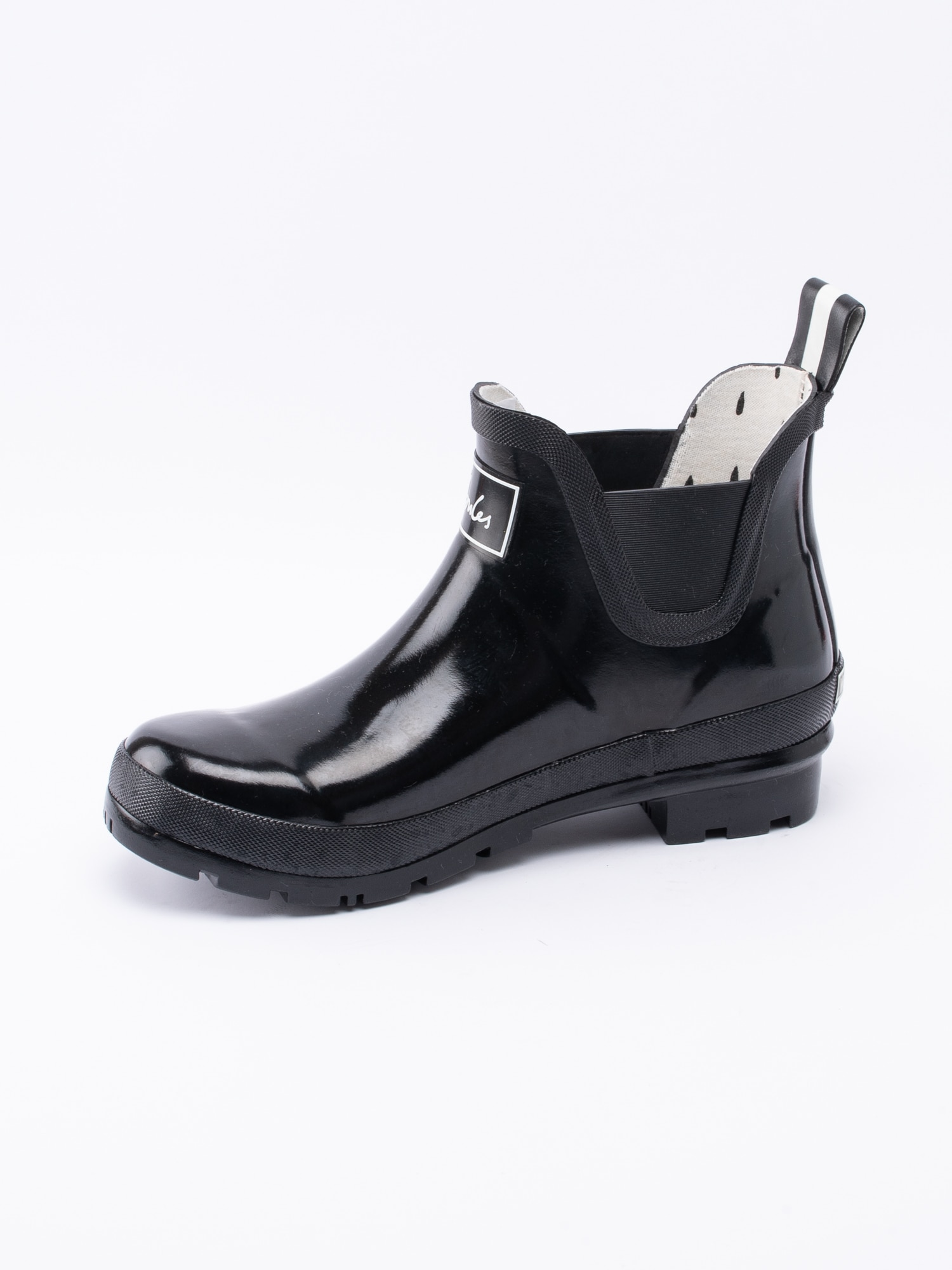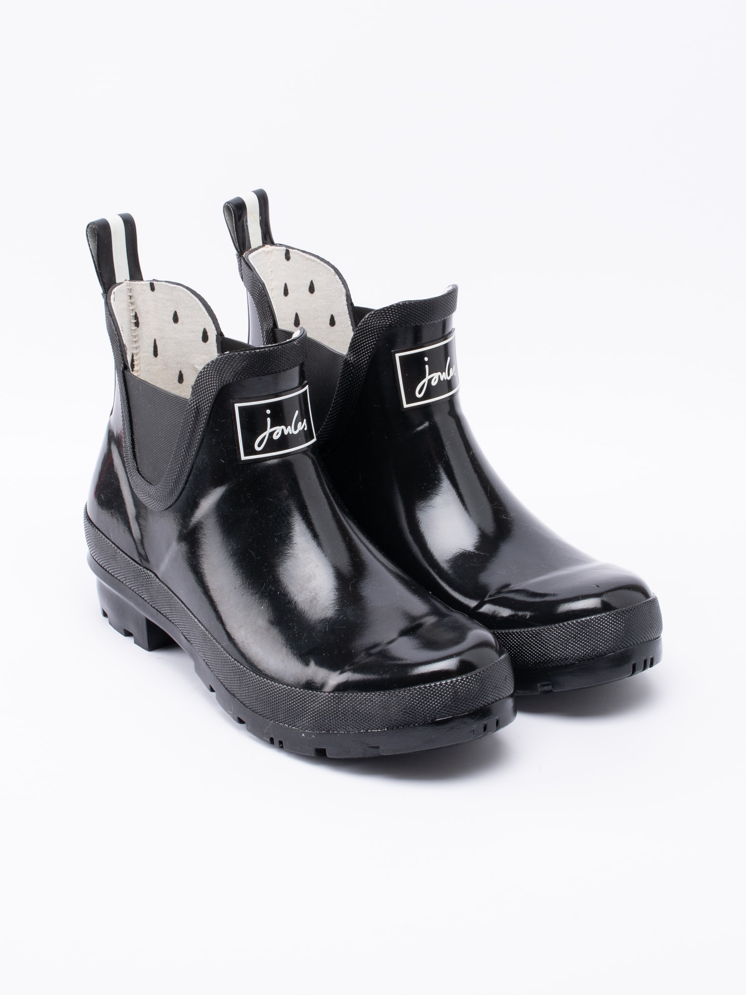 Gummistövel Wellibob Gloss från Joules är svart gummistövel i glansigt naturgummi. Hälla på bakskaft som hjälpmedel vid påtagning. Förstärkt runt skaftkant och sulkant. Vit logga på framsidan av skaftet. Vitt foder i textil och löstagbar innersula i fuskpäls. Svart yttersula i gummi med randigt mönster och logga.