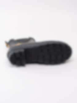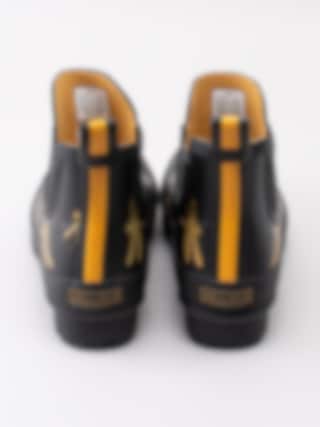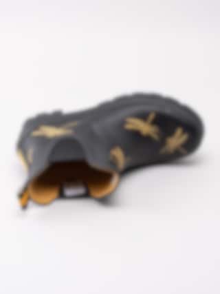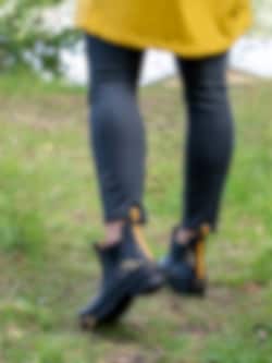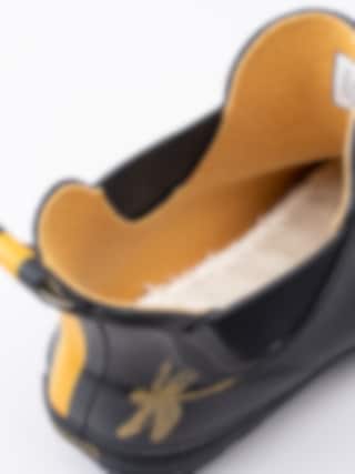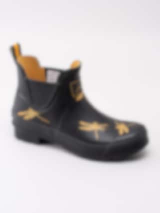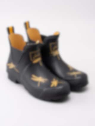 Gummistövel Wellibob från Joules tillverkad i svart naturgummi med gula trollsländor. Gul präglad logga på framsidan av skaftet. Hälla på bakskaft som hjälpmedel vid påtagning. Förstärkt kant runt resår och längs sulan. Gult foder i textil och ljus löstagbar innersula i fuskpäls. Låg klack på ca 3.5 cm. Svart yttersula i gummi med randigt mönster och logga.