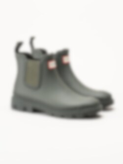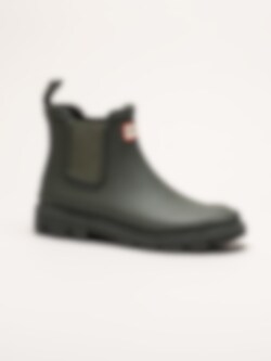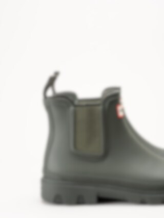 Mörkgröna gummistövlar Chelsea från Hunter i färgen Dark Olive med en klassisk och funktionell design. Ovandelen är tillverkad i naturgummi som ger ett vattentätt och slitstarkt skydd mot väta. Modellen har resårpaneler på vardera sida som gör stövlarna enkla att ta på och av, samt en praktisk draghäll baktill. Observera att resårpartierna inte är helt vattentäta.