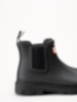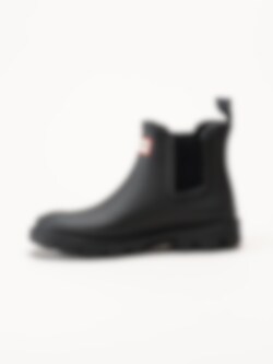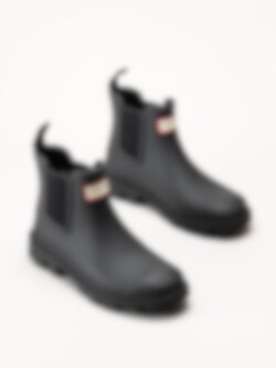 Svarta gummistövlar Chelsea från Hunter med en klassisk och funktionell design. Ovandelen är tillverkad i naturgummi som ger ett vattentätt och slitstarkt skydd mot väta. Modellen har resårpaneler på vardera sida som gör stövlarna enkla att ta på och av, samt en praktisk draghäll baktill. Observera att resårpartierna inte är helt vattentäta.