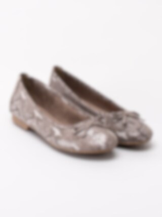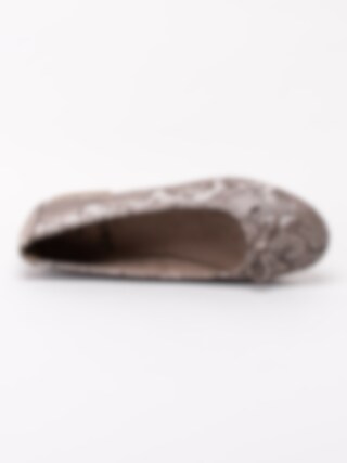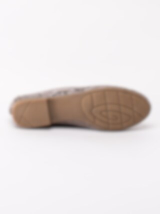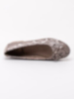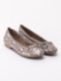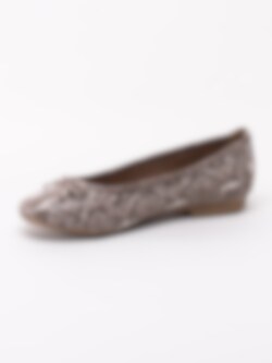 Snakemönstrade ballerina tillverkade i textil från Jana. En dekorativ rosett på ovandel och liten klack. Brunt innerfoder och innersula i textil. Brun yttersula i syntet med mönster. Tillverkade på en H-läst och är därför lite bredare än normalt. En modell tillverkad av 50% återvunnit material i form av pet-flaskor. Perfekt sko till festen och dansgolvet.