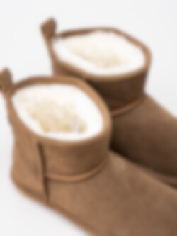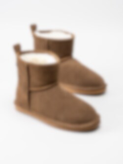 Ljusbruna fårskinnsfodrade boots i mocka från Axelda. Ankelhöga varma boots som håller dina fötter varma. Skorna passar bra både inom och utomhus. Gummisula med EVA membran