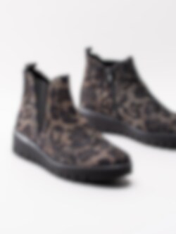 Gråbruna resårboots från Gabor tillverkade i mocka med leopardmönster. Boots med H-läst som innebär att dessa skor är producerad med en bredare läst. V-formad resår på utsidan med dragkedja på insidan som öppning. Hälla på bakskaft som hjälpmedel vid påtagning. Filtfodrade med skön sula håller dig varm under de milda, kalla temperaturerna. Svart, sportiga sula med kiklackslutning.