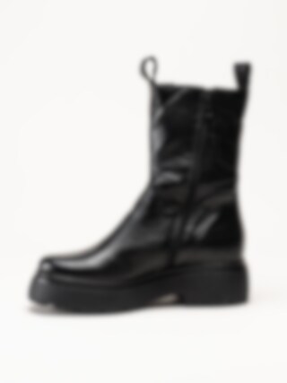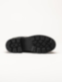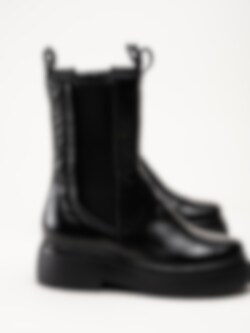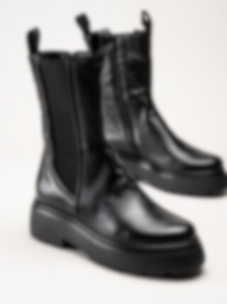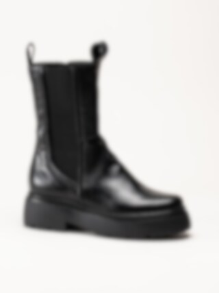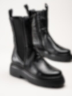 Svarta höga chelsea boots i skinn från Mjus. En tuff modell med grov sula. Innerfoder i textil och innersula i syntet och textil gjort av återvunnet material. Yttersula i gummi med djupt mönster för bästa grepp på underlaget. Ett par riktigt snygga boots med en smickrande silhuett.