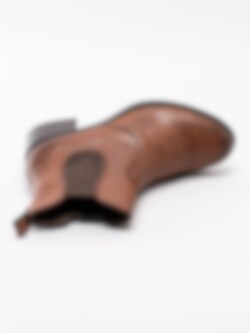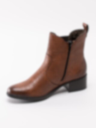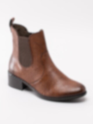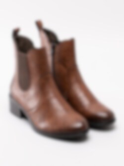 Bruna chelsea boots från Rieker tillverkade i syntet med struktur. Svart dragkedja på insidan som öppning samt resår på utsidan för lätt påtagning. Hälla på bakskaft som hjälpmedel vid påtagning. Mörkbrunt foder i fleece och mörkgrå innersula i filt. Klack i syntet på ca 4.5 cm. Mörkbrun yttersula i syntet med mönstrad trampdel med konturerad röd logga i hälen.