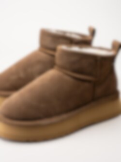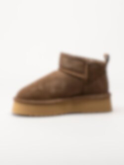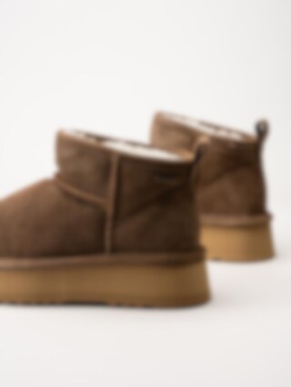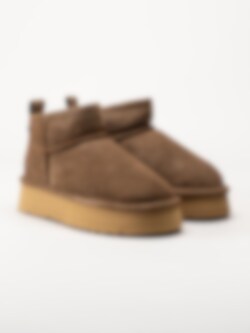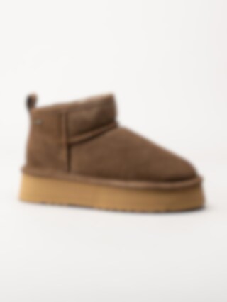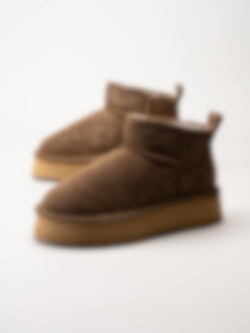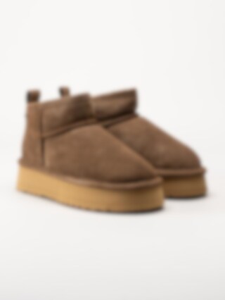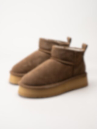 Bruna fårskinnsfodrade boots i mocka från Axelda. Ankelhöga platåboots som håller dina fötter varma tack vare det sköna fårskinnsfodret. Skorna passar bra både inom och utomhus. Gummisula med EVA membran. Trendiga boots tiil höst- och vinterdagar.