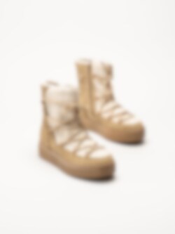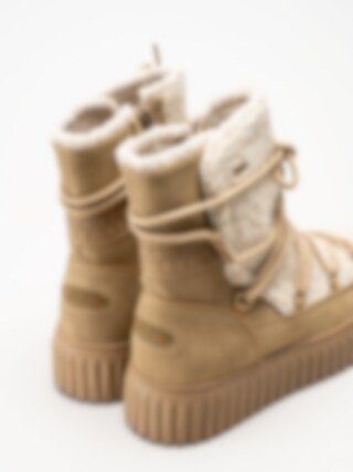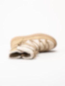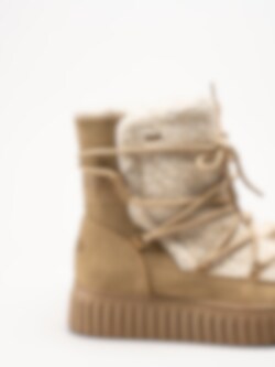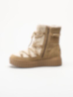Beige fodrade boots från Marco Tozzi i färgen Nougat. En trendig och bekväm vinterboot i mjukt syntetmaterial med varmt teddy pile-foder som håller fötterna sköna under kalla dagar. Modellen har klassisk snörning framtill som gör det enkelt att justera passformen och ger ett stilrent, modernt uttryck. Fodret och innersulan i teddy pile ger en mjuk och värmande känsla, medan den lätta yttersulan i syntet ger bra grepp och stabilitet på olika underlag. Bootsens vattentäta membran håller fötterna torra även vid blöta väderförhållanden, och den vadderade skaftkanten bidrar till extra komfort.