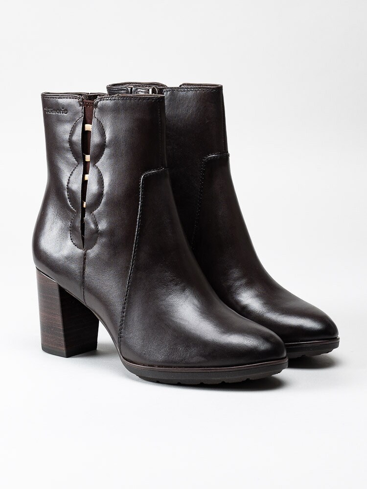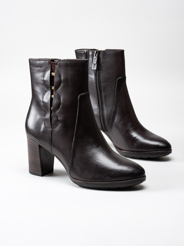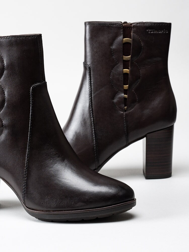 Mörkbruna stövletter från Tamaris. En klassisk modell i skinn med en snygg och dekorativ design på utsidan av skaftet.