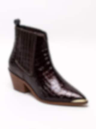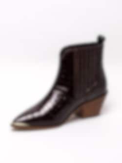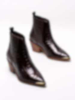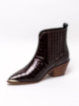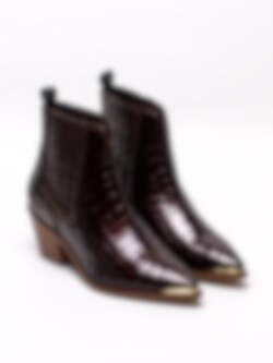 Vinröda westerninspirerade boots Stage från Copenhagen Shoes. Denna tuffa boots i skinnkroko designas i samarbete med Josefine Valentin. Den blir så snygg till festen eller till ett par jeans. Infälld resår på båda sidorna för att lätt komma i och ur. Tåjärn i guld och dragflik baktill. Skinn innersula med 4mm latexskum för bästa komfort. Denna bootsen vill du inte missa!