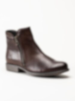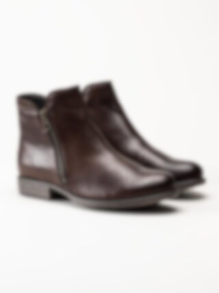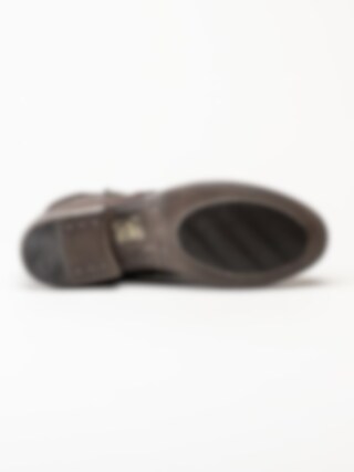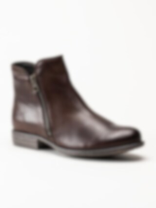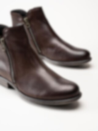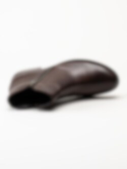 Mörkbruna boots i skinn från Rosa Negra. Två dragkedjor på in- och utsidan som öppning. Präglad logga på utsidan av bakparti. Brunt foder i textil och innersula i skinn med logga. Klädd klack i träimitation. Brun yttersula i syntet med randigt mönster.