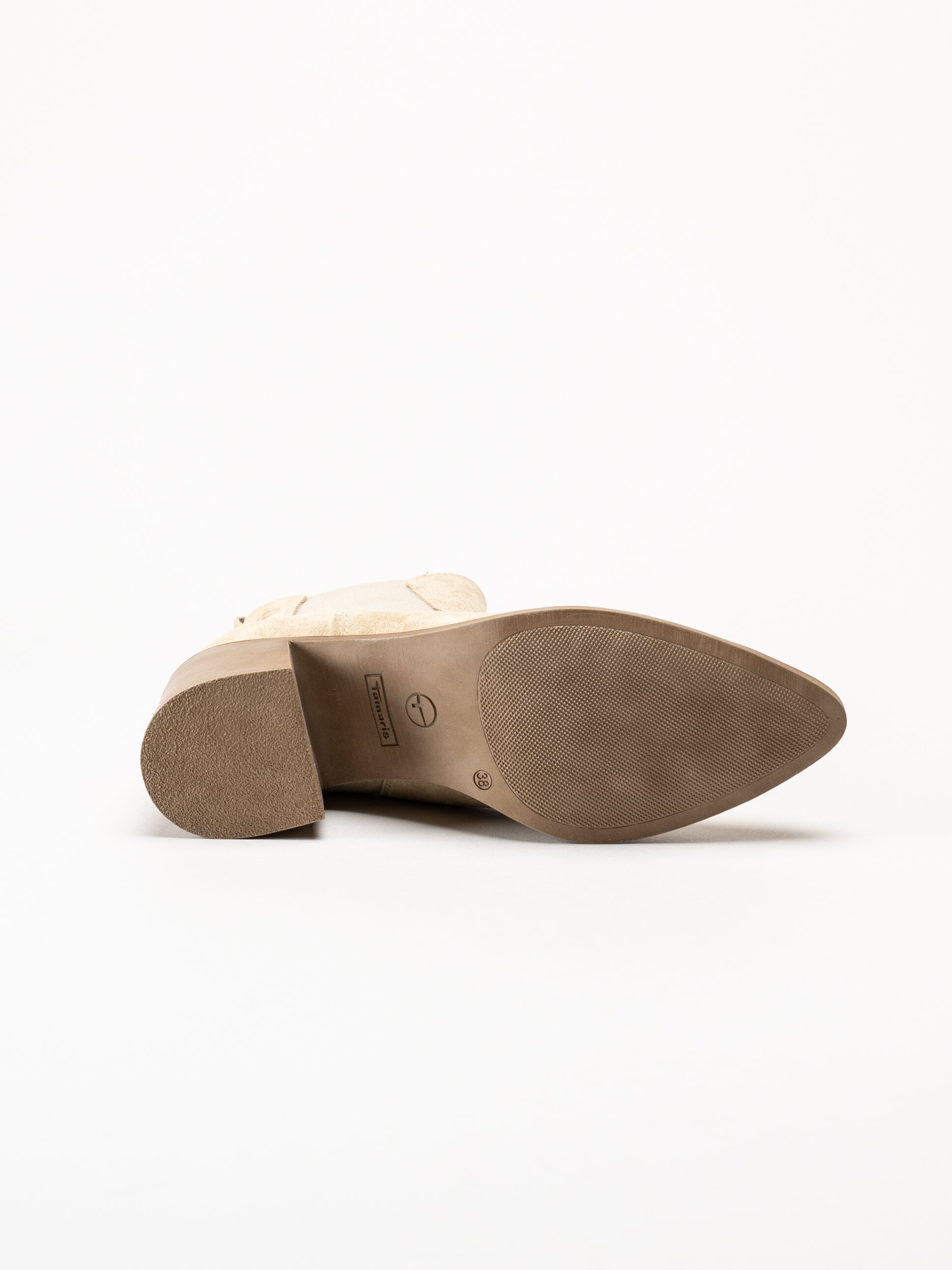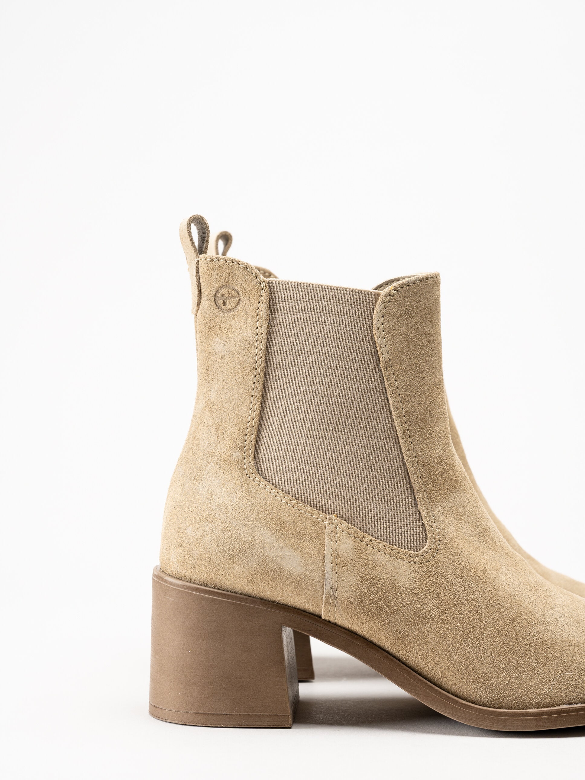 Beige boots i mocka från Tamaris i färgen Beige. En stilren boot tillverkad i mjuk mocka som ger ett elegant och tidlöst uttryck. Modellen har resår på både in- och utsidan som gör den smidig att ta på och av samtidigt som den ger en följsam passform runt foten. Invändigt är bootsen fodrade med textil för en behaglig känsla, och innersulan i en kombination av syntet och textil är utrustad med Tamaris Touch It-teknologi som formar sig efter foten för ökad komfort. Den stabila blockklacken ger ett bra lyft utan att kompromissa med bekvämligheten, medan yttersulan i syntet bidrar med lätthet och stadigt grepp.