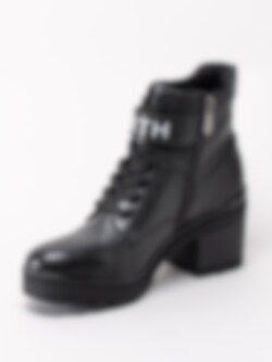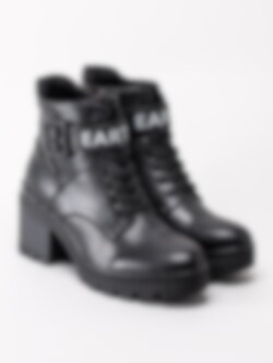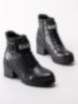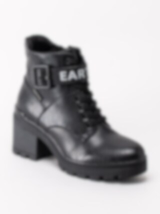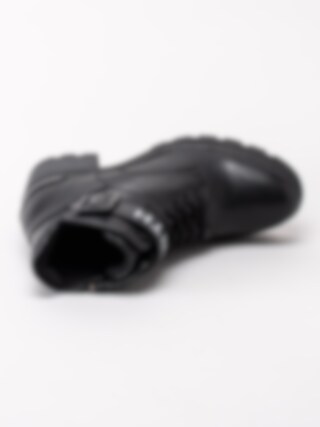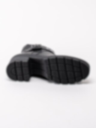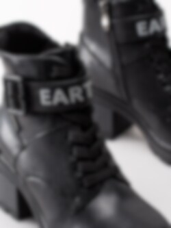 Svarta kängor Earth Edition från Marco Tozzi. Tuff känga i veganskt läder för dig som vill ha miljövänliga alternativ. Snörning för bra passform och med rem och spänne över med text som gör det där lilla extra. Vadderad kant baktill och skönt fleecefoder inuti. Dragkedja på insidan för lätt på och avtagning. Stabil klossklack på ca: 7 cm och platå på ca: 2.5 cm ger den en fin siluett. Grovt räfflad undersula för riktigt bra grepp mot underlaget.