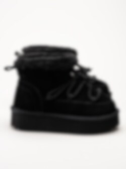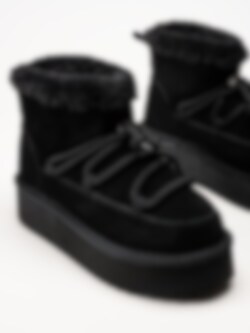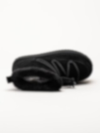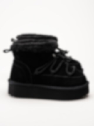 Svarta fodrade boots i mocka från Duffy. Riktigt coola boots med dekorativ snörning och fuskpäls runt skaftkanten. Förstärkta runt hela bootsen för stabilitet. Foder och innersula i mjuk fuskpäls. Tuffa boots med sin plattformssula i syntet på ca 4.5 cm. Bra boots för kalla torra vinterdagar.