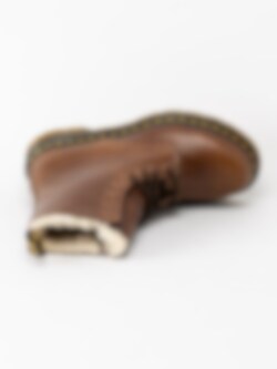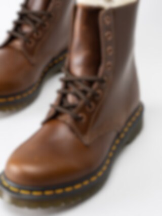 Bruna fodrade kängor Serena från Dr Martens i skinn. Svart snörning i polyester på 8 hål som öppning. Hälla på bakskaft som hjälpmedel vid påtagning. Ljust foder och innersula i fuskpäls. Gul söm längs sulkant. Mörk yttersula i syntet med grovt mönster.