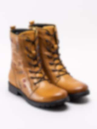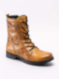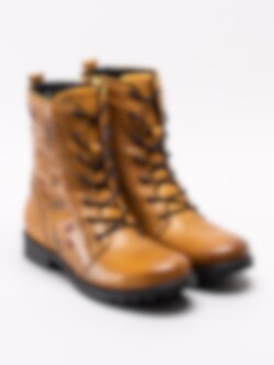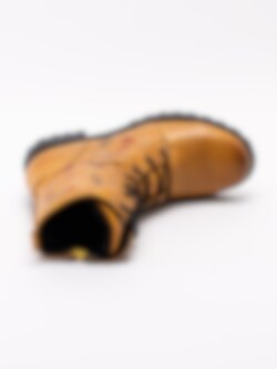 Gula snörkängor från Emma tillverkade i mjukt skinn. Klassiska snörkängor med något högre skaft. Blombroderingar längs skaftet som ger de klassiska kängorna en personlig touch. Varmfodrade med teddy pile med dragkedja på insidan som öppning.