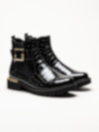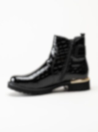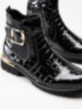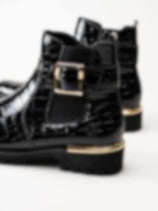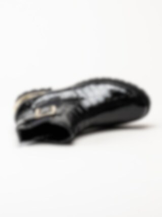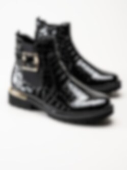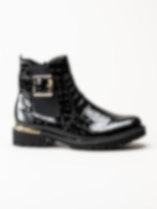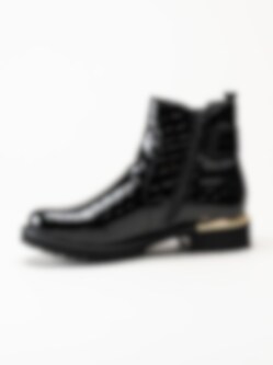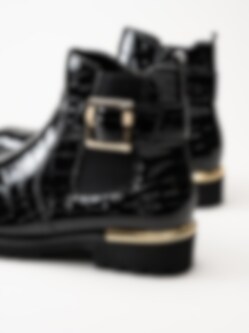 Svarta jodhpurs i krokomönster från Remonte. Snygga boots med krokomotiv och fina gulddetaljer i syntet-lack. Resår på utsidan och dragkedja på insidan för smidig på- och avtagning. Foder i mjuk fleece och vadderad löstagbar innersula i filt. Yttersula i syntet med grovt mönster för ett bättre grepp mot underlaget och en klackhöjd på ca 3.5 cm. När du vill vara extra snygg så är den här bootsen en riktig hit!