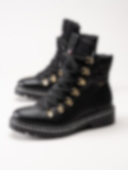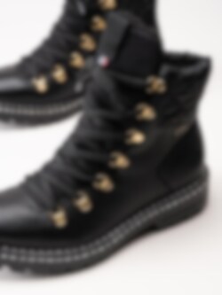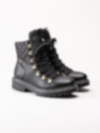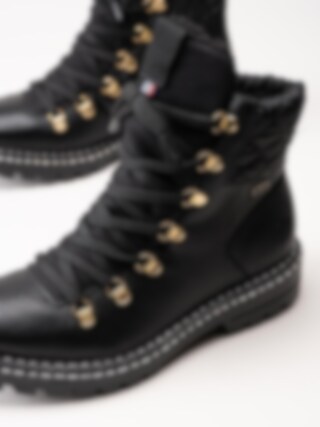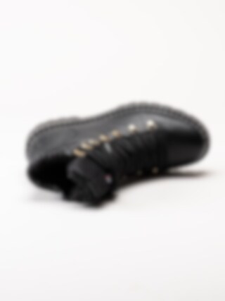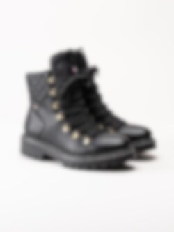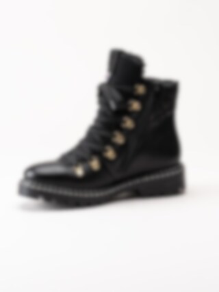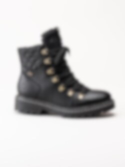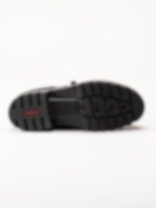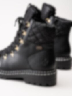 Svarta fodrade kängor i syntet och textil från Rieker. Skorna har Rieker-Tex som gör den vattenavvisande och du håller dig torr om fötterna. Med dragkedja på insidan och resårsnörning gör det lättare att ta på sig skorna och du får en perfekt passform. Snygga detaljer som kviltad kant, guldfärgade öljetter och två vita sömmar runt kanten på sulan. Grov sula som ger ett riktigt bra grepp. Snygg känga för kallare temperaturer.