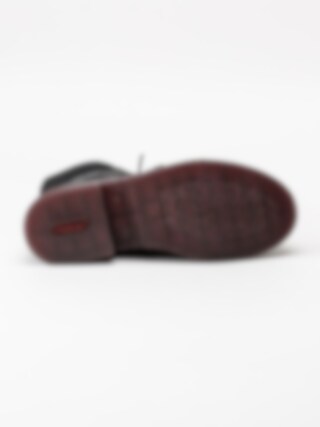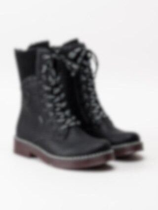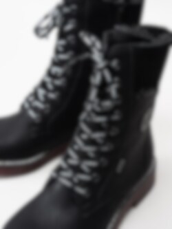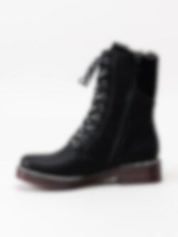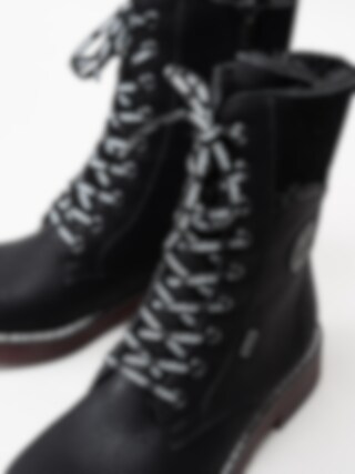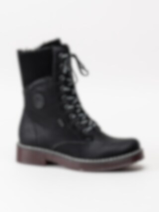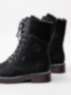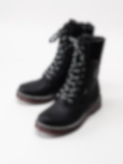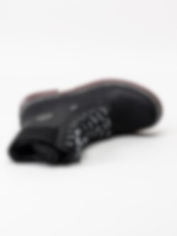 Svarta fodrade kängor tillverkade i syntetiskt material från Rieker. Snygga skor med 9 håls snörning och utrustade i rieker-tex. Dokartiv del i mocka på baksidan av skon.