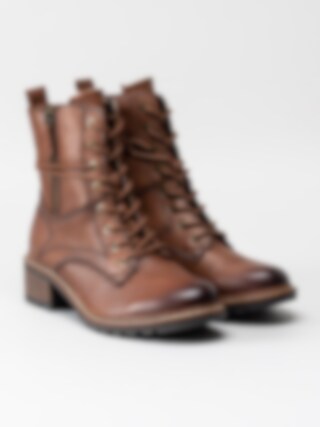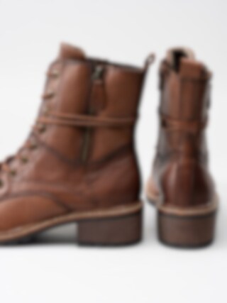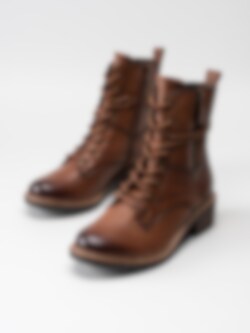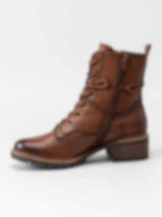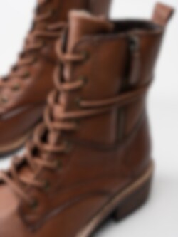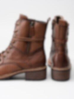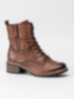 Ljusbruna kängor i skinn från Jana. Snygga skor i klassisk stil med 8 hålsnörning samt en dekorativ del där snörningen går runt skon. Dragkedjor på båda sidorna av skon samt hälla på bakskaft som hjälpmedel vid av- och påtagning.