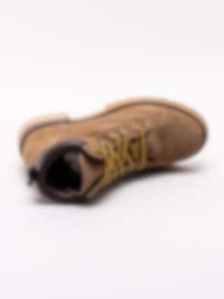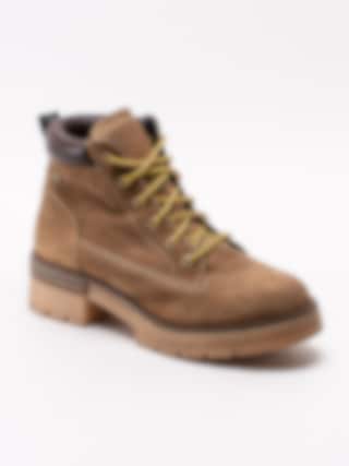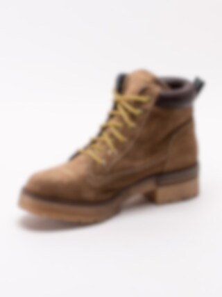 Ljusbruna snörkängor Gayle från Musse and Cloud tillverkade i mocka med vadderad skaftmudd i syntet. Sköna och klassiska snörkängor med en tidlös design som passar för alla åldrar. Bronsfärgad smyckeslogga på utsidan skaftet. Guldbrun snörning i stark polyester så du kan snöra åt dina kängor efter din passform. Svart hälla i nylon med logga längs bakskaft. Textilfodrad med mjuk innersula med mjuk fotbädd i skumgummi. Crepeinspirerad grov sula med klack på ca 4 cm.