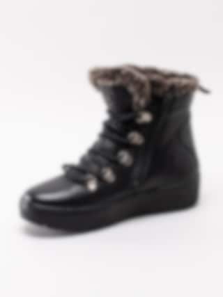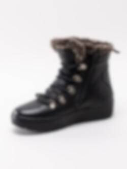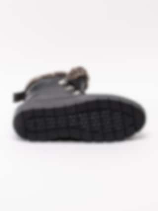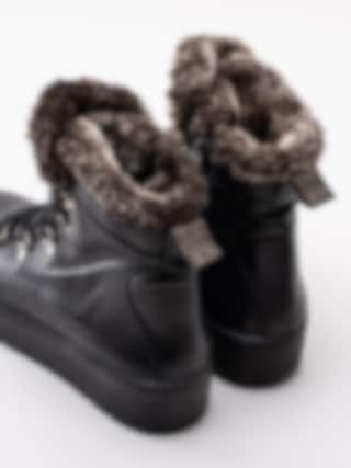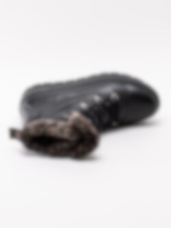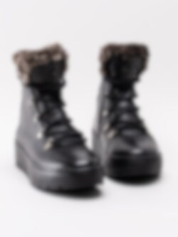 Svarta kängor Spirea från Dasia. Tillverkade i skinn med skaft- och plöskant i brun-melerad fuskpäls. Ungdomligare känga med platå som håller dig varm under vintern. Smyckeslogga på plös och präglad logga på utsidan av skaftet som detalj. Silverfärgad vandringsdetalj vid snörparti.
