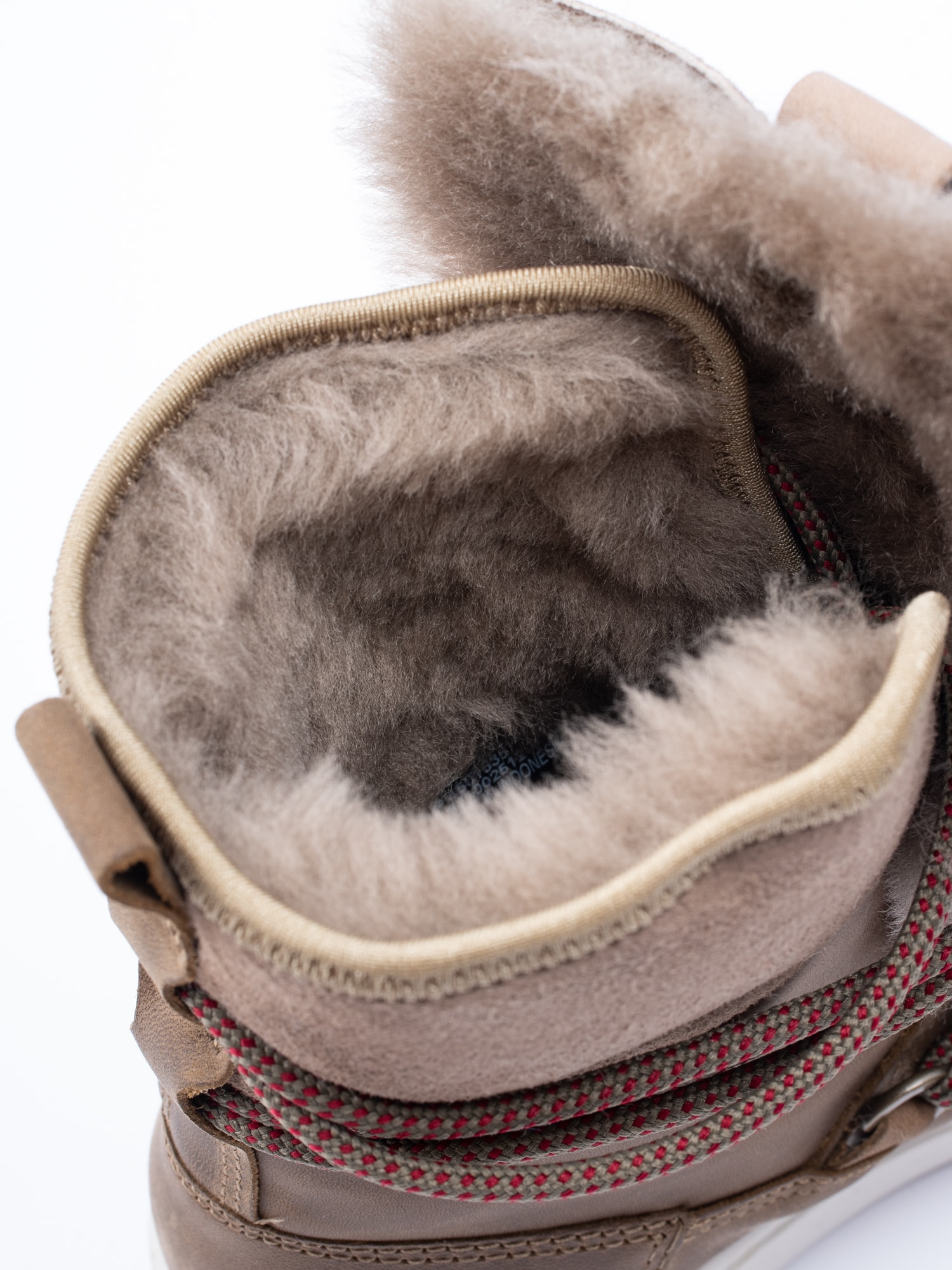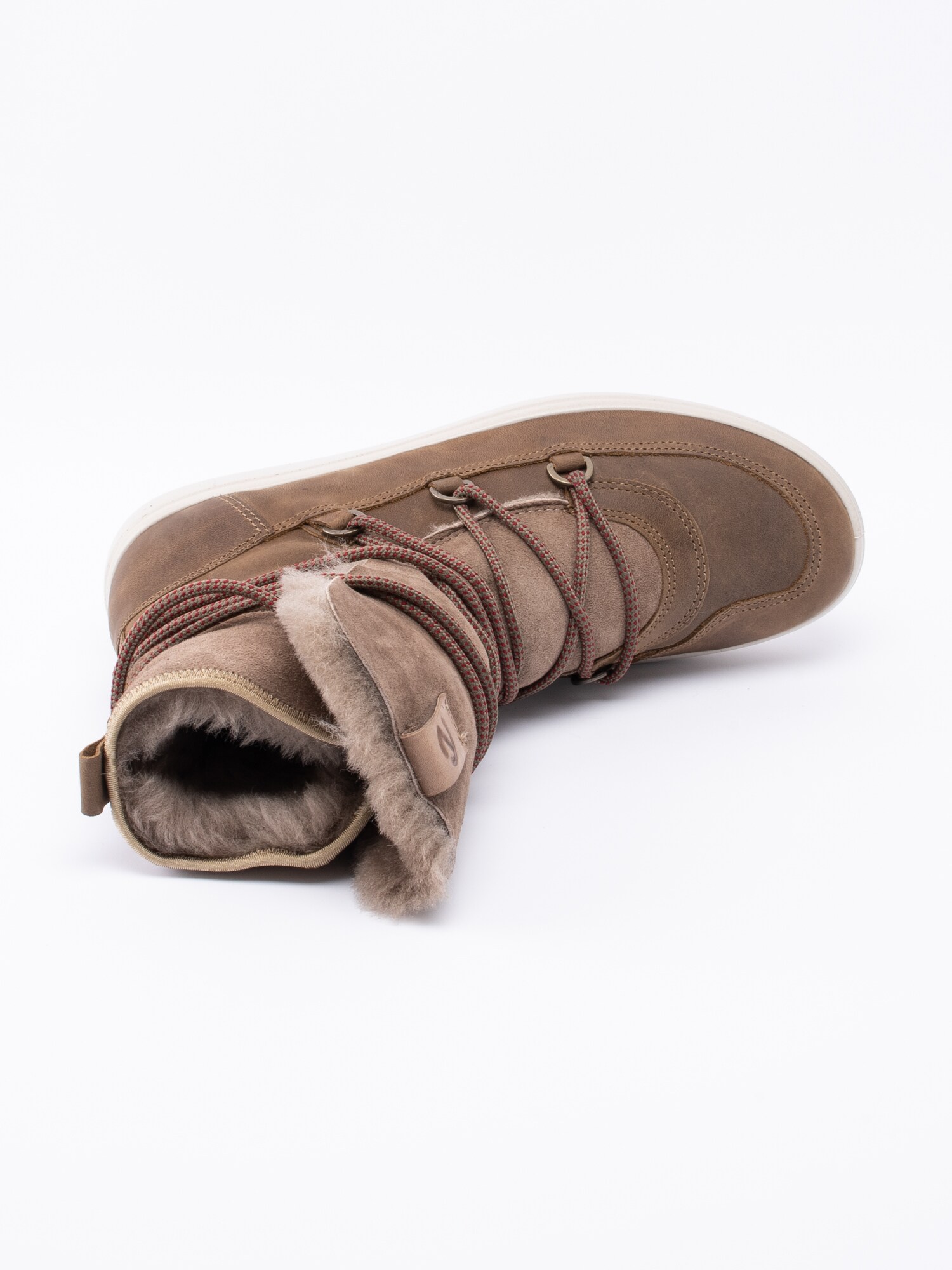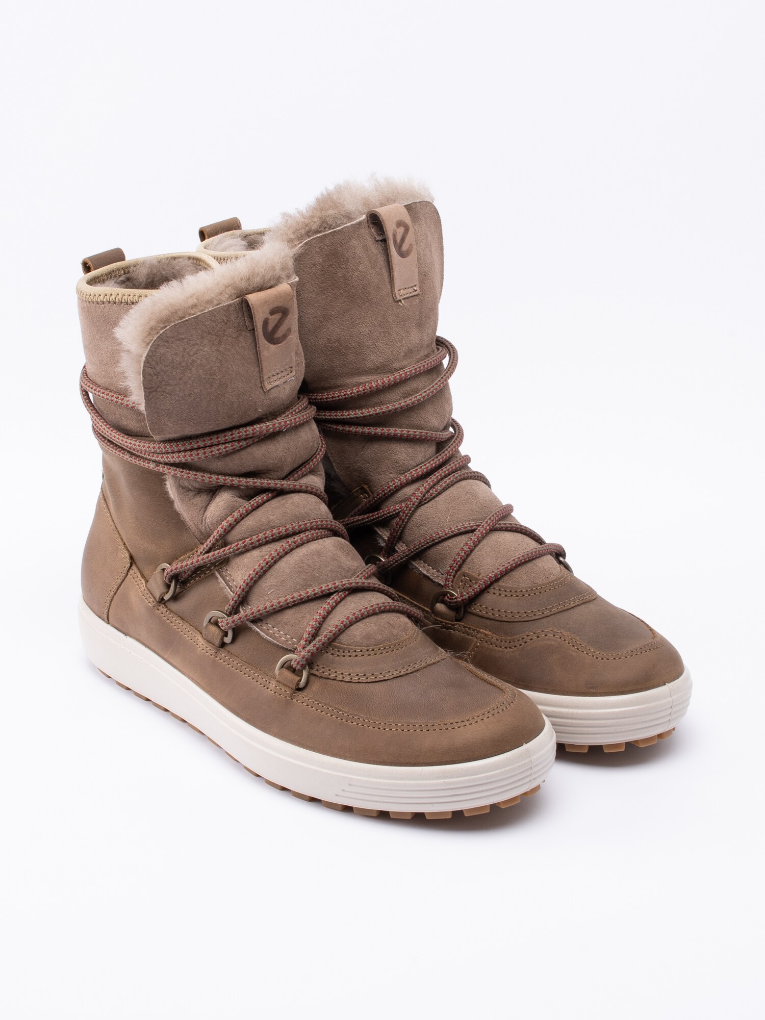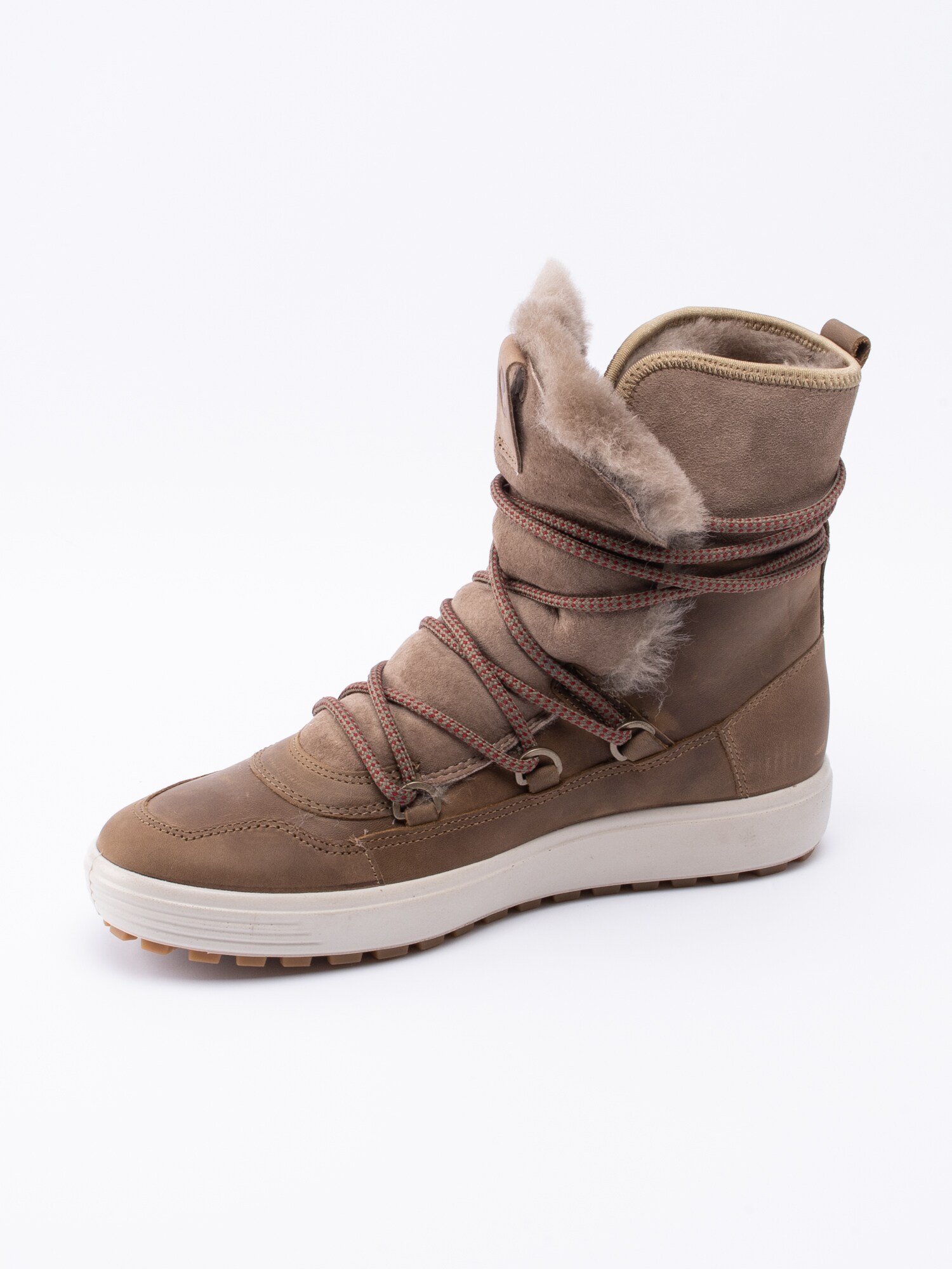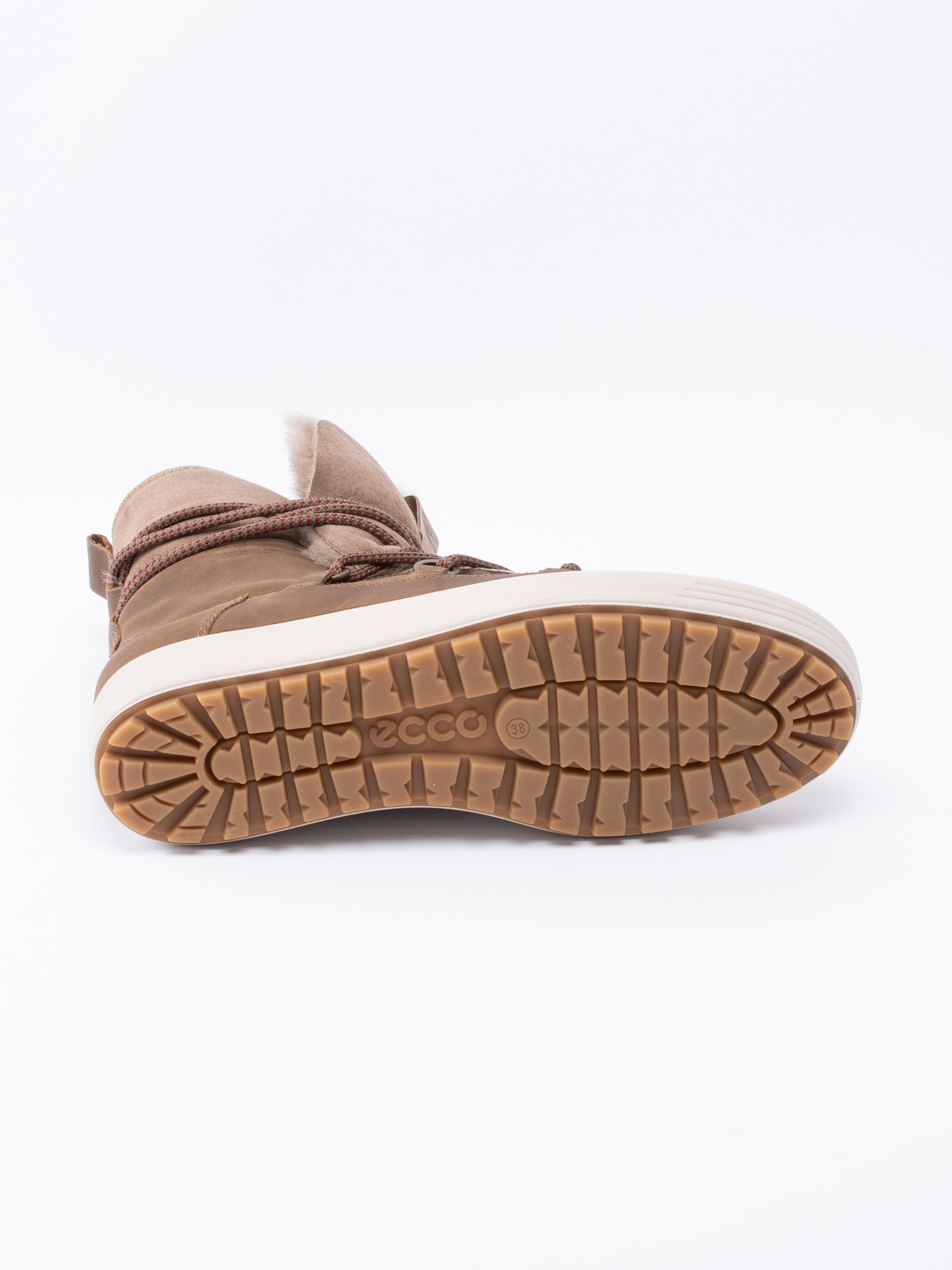 Vinterkänga Soft 7 Tred för kvinnor från Ecco är en fårskinnsfodrad snörkänga i oljad nubuck. Plös och skaftmudd i mocka. Beigeröd snörning i polyester på 3 hål som öppning. Läderbit med logga på plös. Beigt foder i fårskinn och löstagbar innersula i ull. Vit mellansula med beige yttersula i gummi med grovt mönster och logga.