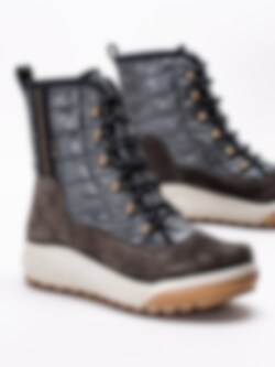 Grå vinterkängor Tirano från Legero tillverkade i nylon med botten i mocka. Varma vinterkängor med Gore-Tex membran som gör att du håller dig varm och garanterat torr om fötterna! 6 håls-snörning i nylon som öppning med bronsfärgade knappar som håller snörningen på plats. Tjock sula för att få ett avstånd från marken och kylan. Beige yttersula i syntet med vågigt mönster.