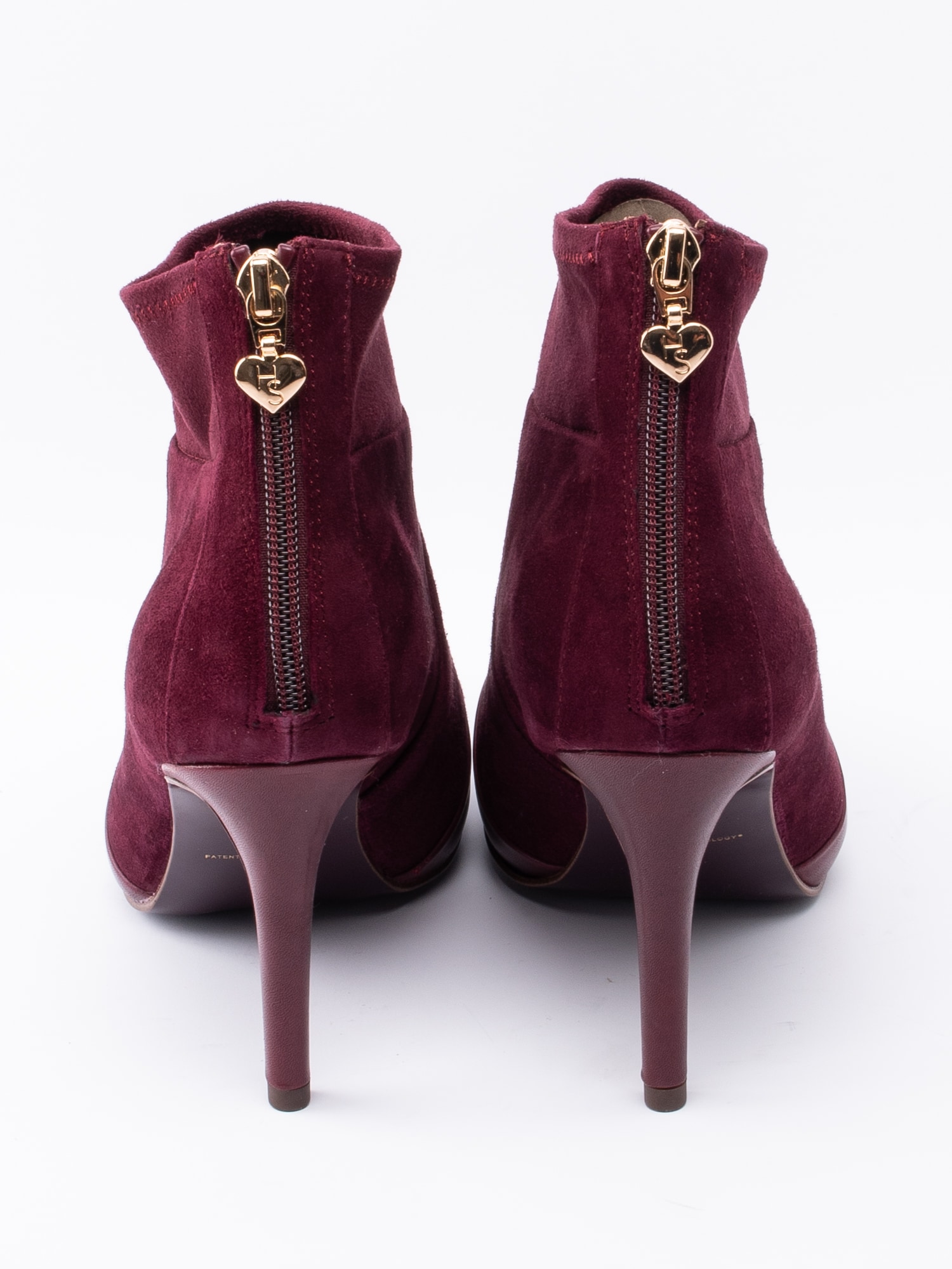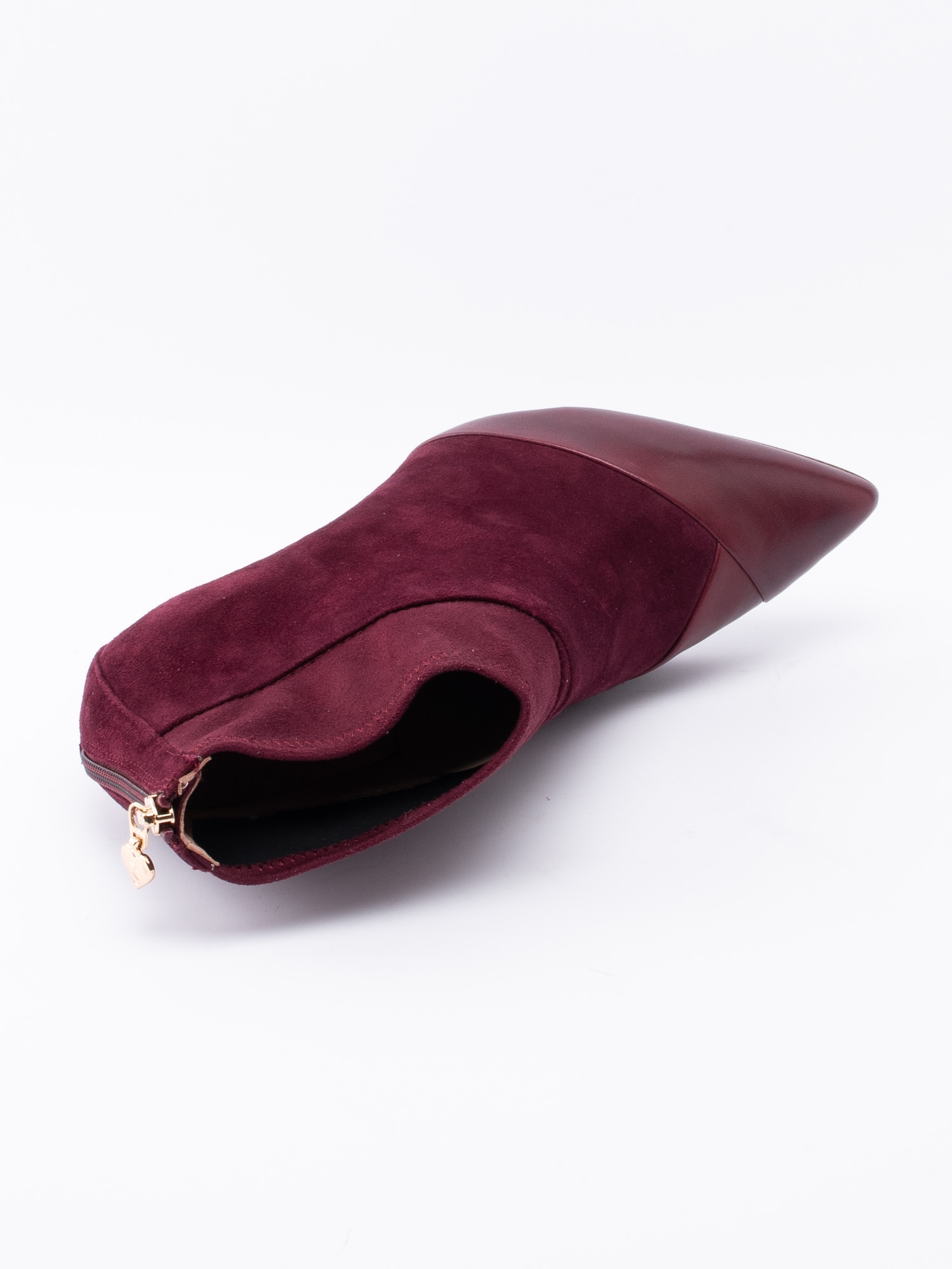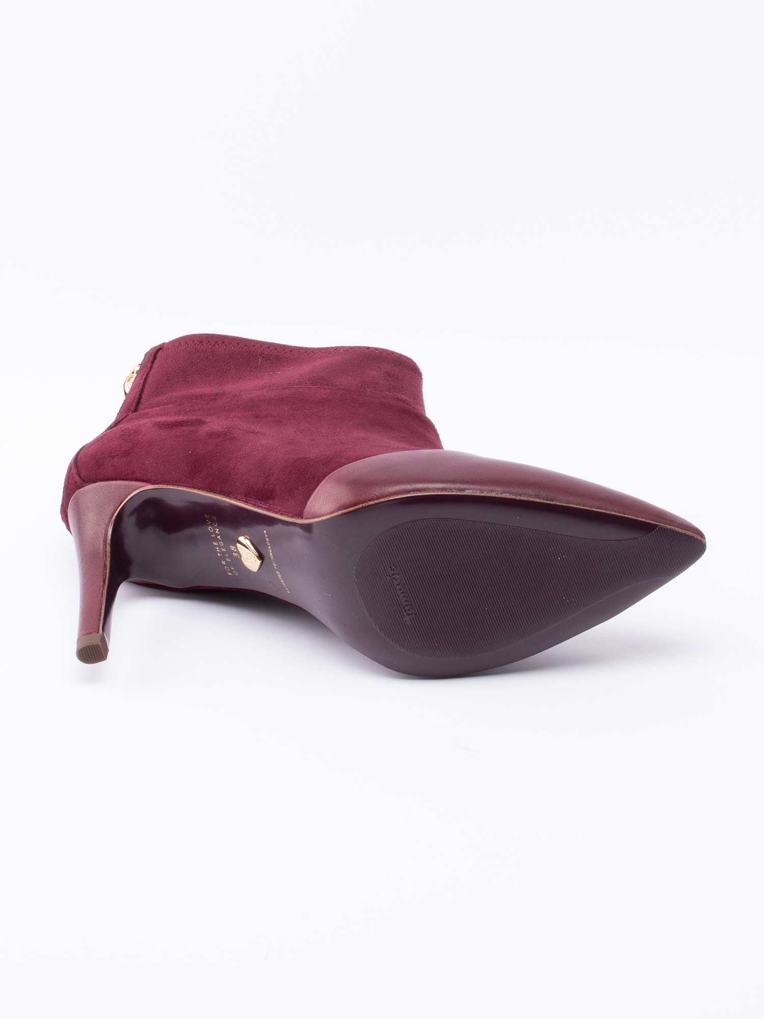 Mörkröd stövlett från Tamaris Heart & Sole i mocka. Skaftkant i mjuk textil för en skönare känsla. Spetsig tå i skinn. Dragkedja på baksidan med ett hjärta i guld som öppning. Mörkrött foder i textil och rosa, löstagbar innersula i mocka med präglad logga. Klädd stilettklack i syntet på ca 8.5 cm höjd. Mörklila yttersula i syntet med slät yta och logga.