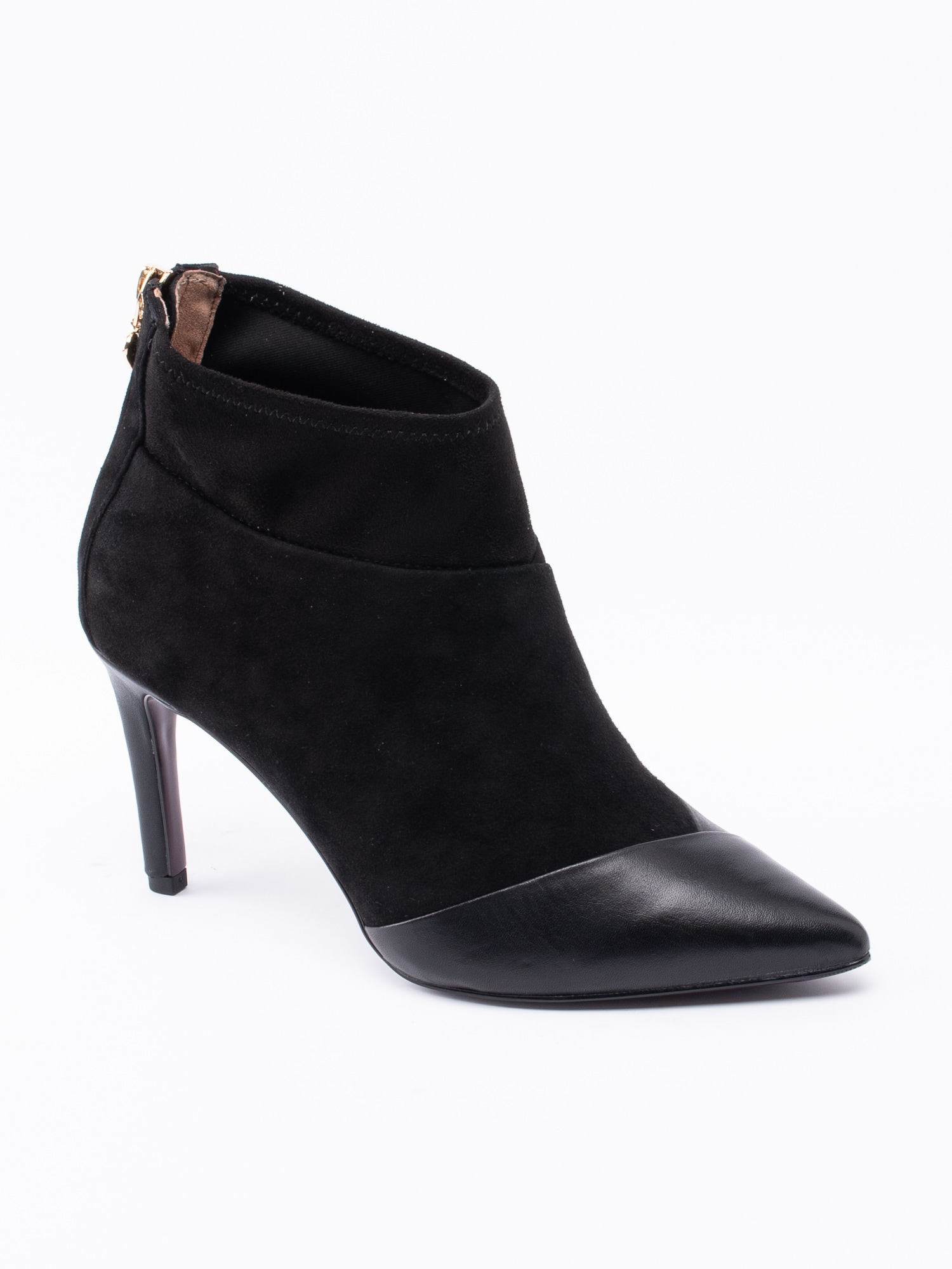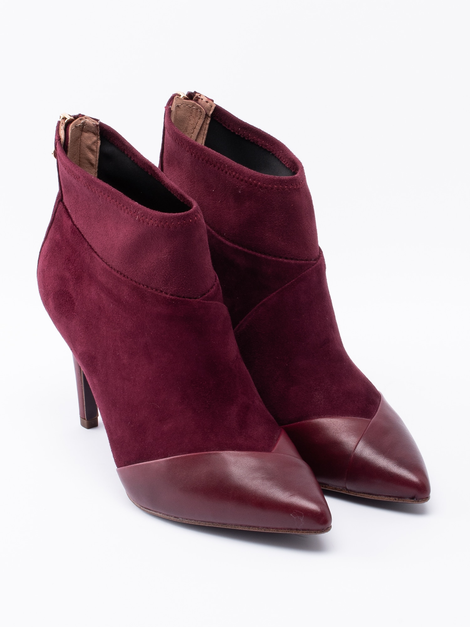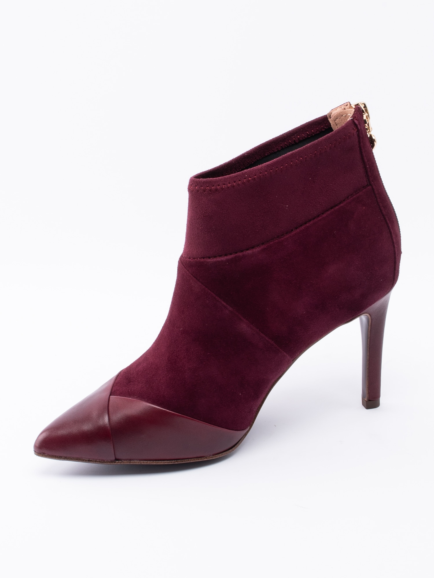 Mörkröd stövlett från Tamaris Heart & Sole i mocka. Skaftkant i mjuk textil för en skönare känsla. Spetsig tå i skinn. Dragkedja på baksidan med ett hjärta i guld som öppning. Mörkrött foder i textil och rosa, löstagbar innersula i mocka med präglad logga. Klädd stilettklack i syntet på ca 8.5 cm höjd. Mörklila yttersula i syntet med slät yta och logga.